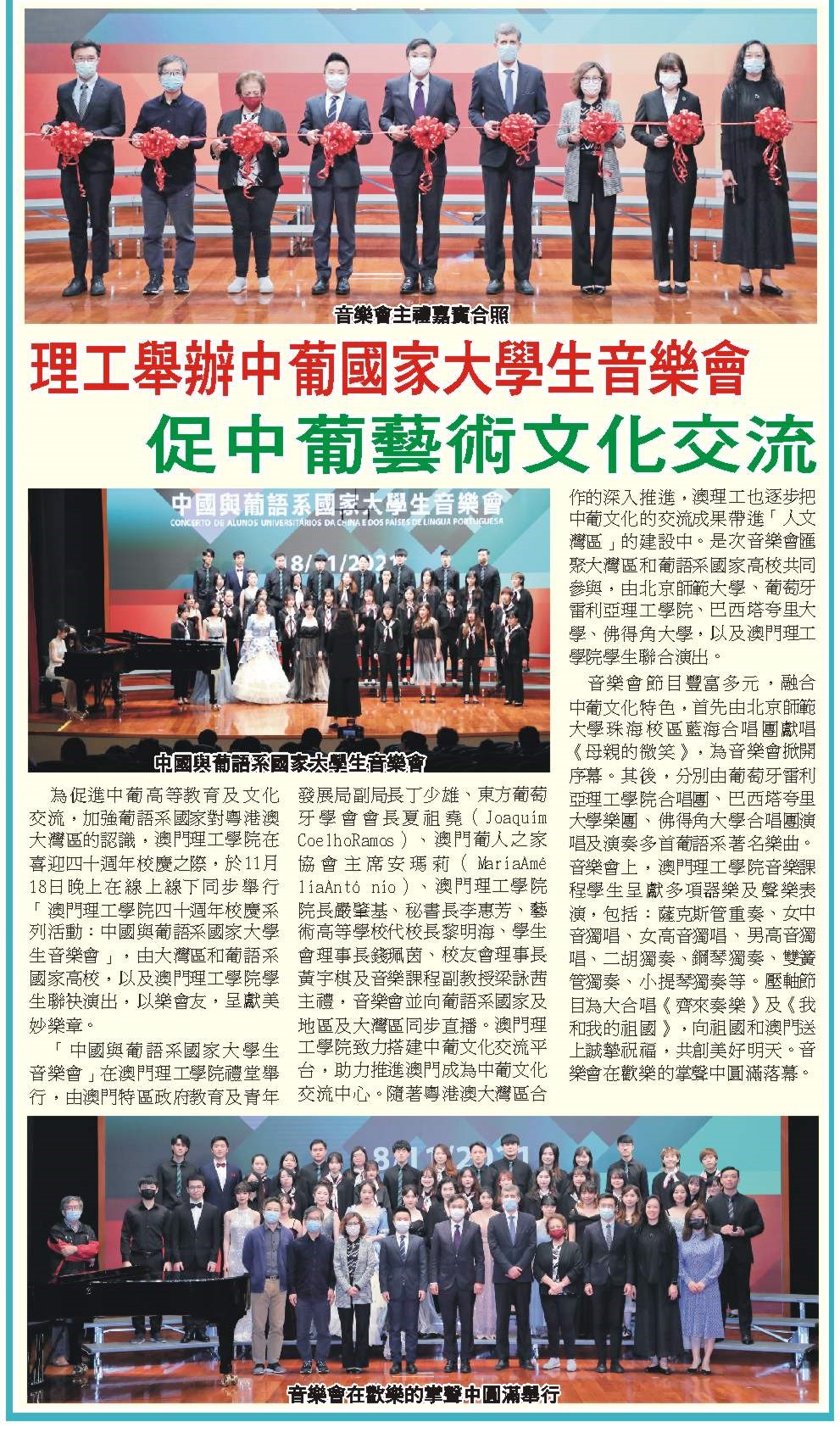 O “Concerto de Alunos Universitários da China e dos Países de Língua Portuguesa” teve lugar no Auditório do Instituto Politécnico de Macau. Presidiram a inauguração os seguintes convidados: o Subdirector dos Serviços de Educação e de Desenvolvimento da Juventude, Teng Sio Hong; o Director do Instituto Português do Oriente, Joaquim Coelho Ramos; a Presidente da Casa de Portugal em Macau, Maria Amélia António; o Presidente do Instituto Politécnico de Macau, Im Sio Kei; a Secretária-Geral, Lei Vai Fong; o Director, substituto, da Escola Superior de Artes, Lai Meng Hoi; a Presidente da Direcção da Associação dos Estudantes, Chin Pui Ian; o Presidente da Direcção da Associação dos Antigos Alunos, Wong U Kei; e a Professora Adjunta do Curso de Música, Maria Vanessa Leão. O Concerto foi transmitido em directo para os países lusófonos e regiões da Área da Grande Baía Guangdong-Hong Kong-Macau. O IPM está empenhado na construção de uma plataforma de intercâmbio cultural entre a China e os Países de Língua Portuguesa, contribuindo para a transformação de Macau num “Centro de Intercâmbio Cultural entre a China e os Países de Língua Portuguesa”. Com o aprofundamento da cooperação da Grande Baía Guangdong-Hong Kong-Macau, o IPM tem vindo a introduzir, gradualmente, os resultados do intercâmbio cultural entre a China e os Países Lusófonos na construção da “Grande Baía Humanista”. Este Concerto reuniu a participação dos alunos das instituições do ensino superior da Grande Baía e dos Países de Língua Portuguesa, nomeadamente a Universidade Normal de Pequim, o Instituto Politécnico de Leiria, a Universidade do Vale do Taquari (Univates) do Brasil, a Universidade de Cabo Verde e o Instituto Politécnico de Macau.
