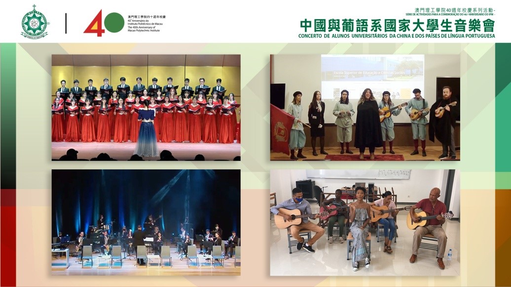 Para promover o intercâmbio entre a China e os Países de Língua Portuguesa, nas áreas do ensino superior e do intercâmbio cultural, bem como para aprofundar o conhecimento dos Países de Língua Portuguesa sobre a Grande Baía Guangdong-Hong Kong-Macau, coincidindo com a celebração do 40.º aniversário do Instituto Politécnico de Macau (IPM), no âmbito da “Série de Actividades para a Comemoração do 40.º Aniversário do Instituto”, o IPM organizou o “Concerto de Alunos Universitários da China e dos Países de Língua Portuguesa”, que se realizou na noite do dia 18 de Novembro, no mesmo Instituto e com a emissão directa online. Este Concerto foi apresentado, em conjunto, pelos alunos do IPM e das instituições da Grande Baía e dos Países de Língua Portuguesa, tendo estes alunos partilhado com os colegas vários espectáculos musicais maravilhosos, transmitindo energias positivas e alegria.