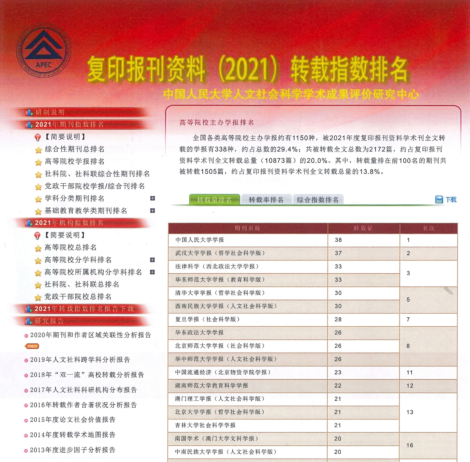 Divulgação do “The Selected Materials Reprinting Index Ranking Report by Renmin University of China 2021