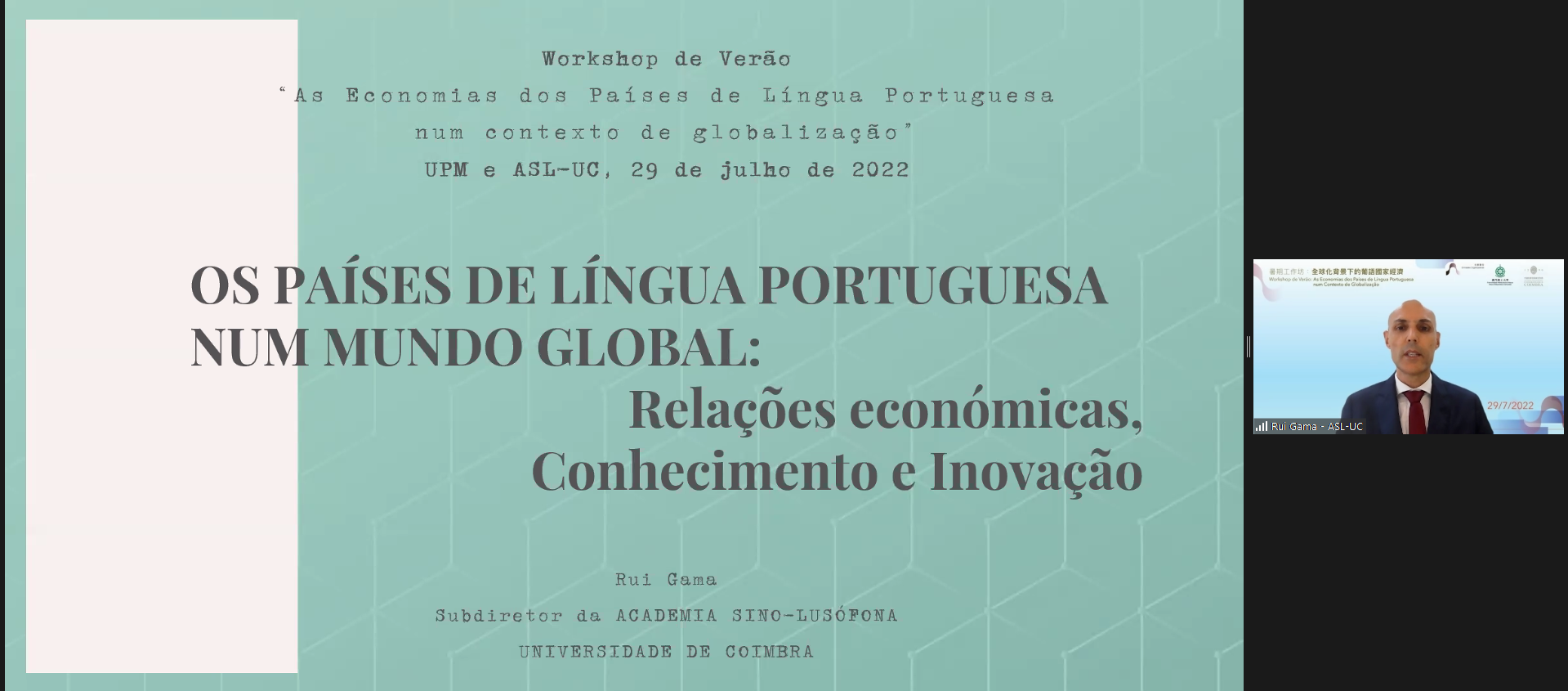 Com o objectivo de promover ainda mais o nível dos trabalhos de ensino e de investigação da língua portuguesa em Macau, no Interior da China e na Região da Ásia-Pacífico, desempenhar o papel de Macau como a “Plataforma de Serviços para a Cooperação Comercial entre a China e os Países de Língua Portuguesa” e apoiar a construção em Macau a “Base de Formação de Quadros Bilingues de Chinês e Português”, o Centro Pedagógico e Científico da Língua Portuguesa da Universidade Politécnica de Macau (CPCLP-UPM) e a Academia Sino-Lusófona da Universidade de Coimbra (ASL-UC) organizaram, em conjunto, um workshop de Verão, por via online, dirigido a docentes e alunos de português, intitulado “Economias dos Países de Língua Portuguesa num contexto de globalização”, realizado no dia 29 de Julho. Tendo como foco a cooperação estratégica e no intercâmbio comercial entre a China e os Países Lusófonos, no workshop foram abordados vários assuntos relacionados com a situação presente e as perspectivas futuras do desenvolvimento económico dos Países de Língua Portuguesa, tendo o mesmo atraído a participação de mais de 100 alunos, docentes e investigadores de instituições de ensino superior de Macau, do Interior da China e dos Países Lusófonos, especialmente da área de ensino do português.
