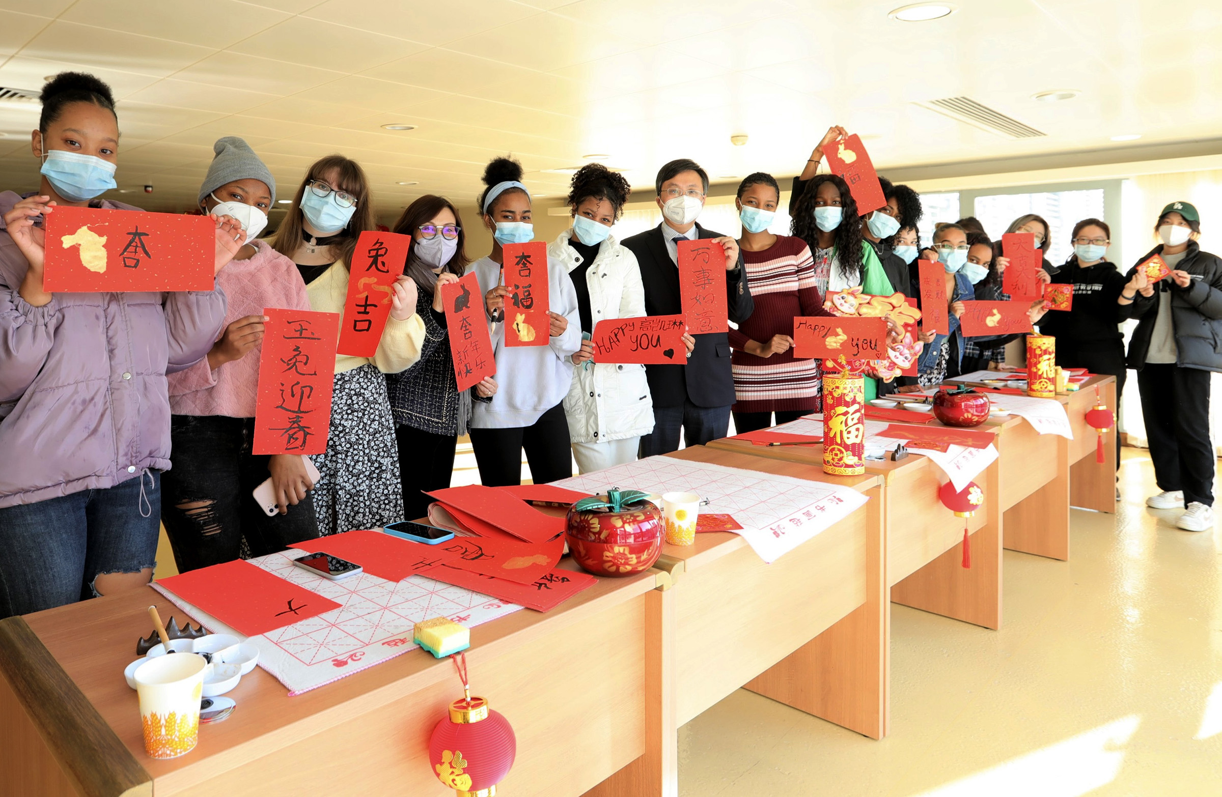 O Reitor da Universidade Politécnica de Macau, ao festejar o Ano Novo Lunar em conjunto com os alunos e professores, escreveu os novos desejos para o Ano do Coelho em papel vermelho com tinta dourada, num ambiente animado e com muitas gargalhadas. O Reitor Im Sio Kei teve ainda uma conversa cordial com os alunos, desejando-lhes que, no novo ano, tenham uma atitude activa e um espírito cheio de energia para se dedicarem à aprendizagem e avançarem em direcção a objectivos de vida mais elevados, mais longínquos e mais brilhantes. Os alunos participantes afirmaram-se muito satisfeitos por terem conseguido reunir-se com os professores e colegas da UPM para celebrar o Ano Novo, o que lhes permitiu sentir o calor e a atmosfera alegre da celebração do Ano Novo Chinês em Macau.