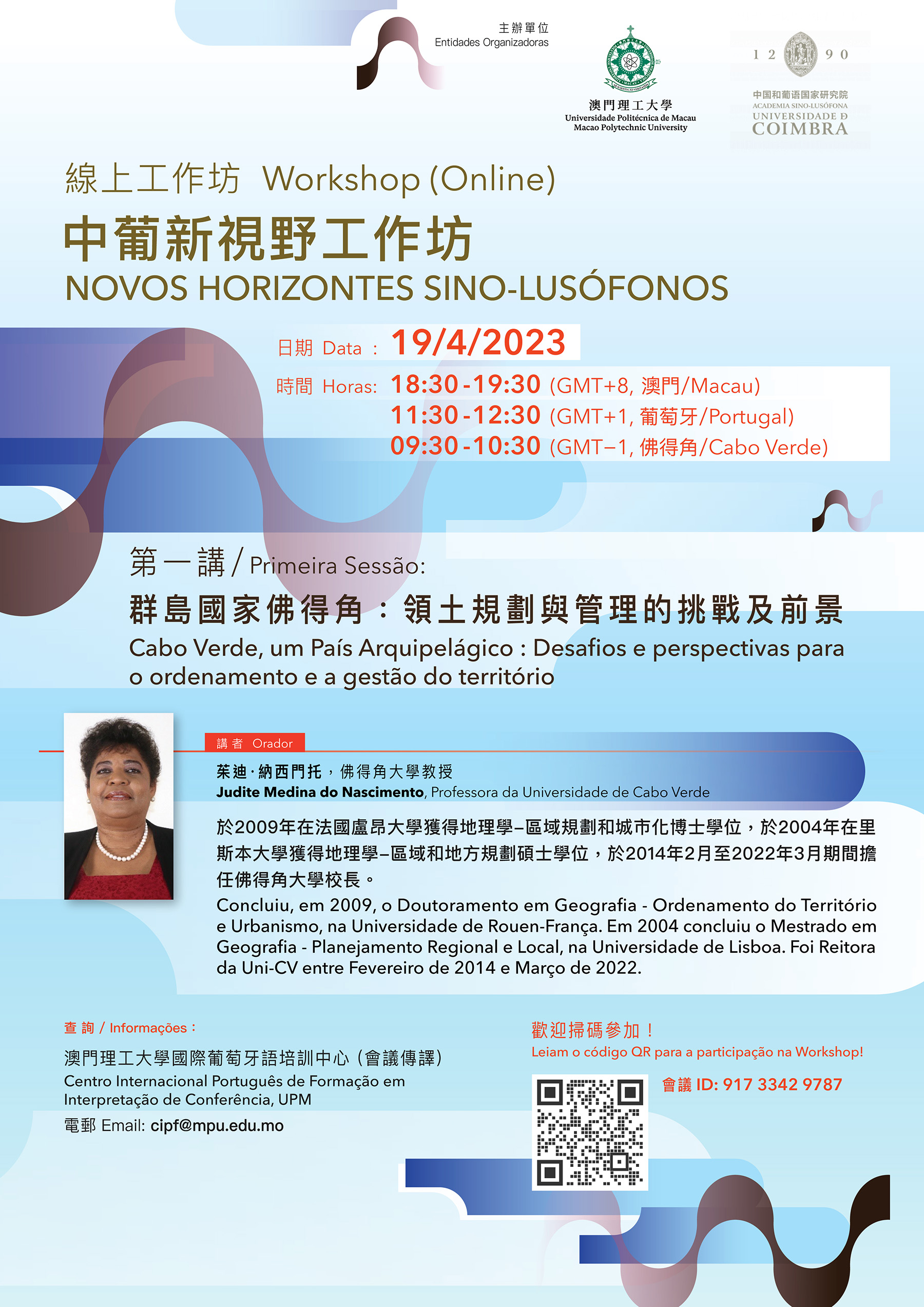 Com o objectivo de analisar e promover novas oportunidades motivadas pelas Linhas Gerais do Planeamento para o Desenvolvimento da Grande Baía Guangdong-Hong Kong-Macau e apoiar o papel de Macau enquanto Plataforma de Serviços entre a China e os Países de Língua Portuguesa, o Centro Internacional Português de Formação em Interpretação de Conferência (CIPF) da Universidade Politécnica de Macau (UPM) e a Academia Sino-Lusófona da Universidade de Coimbra (ASL-UC) organizam conjuntamente um programa de workshops sob o tema: “Novos Horizontes Sino-Lusófonos”, com a participação de convidados de diferentes geografias e percursos académicos e profissionais. A primeira sessão da Workshop “Novos Horizontes Sino-Lusófonos”, intitulada “Cabo Verde, um País Arquipelágico: Desafios e perspectivas para o ordenamento e a gestão do território”, terá lugar no dia 19 de Abril (quarta-feira) e será dirigida pela Prof.ª Doutora Judite Medina do Nascimento, ex-reitora da Universidade de Cabo Verde (Uni-CV). Todos os interessados serão bem-vindos.