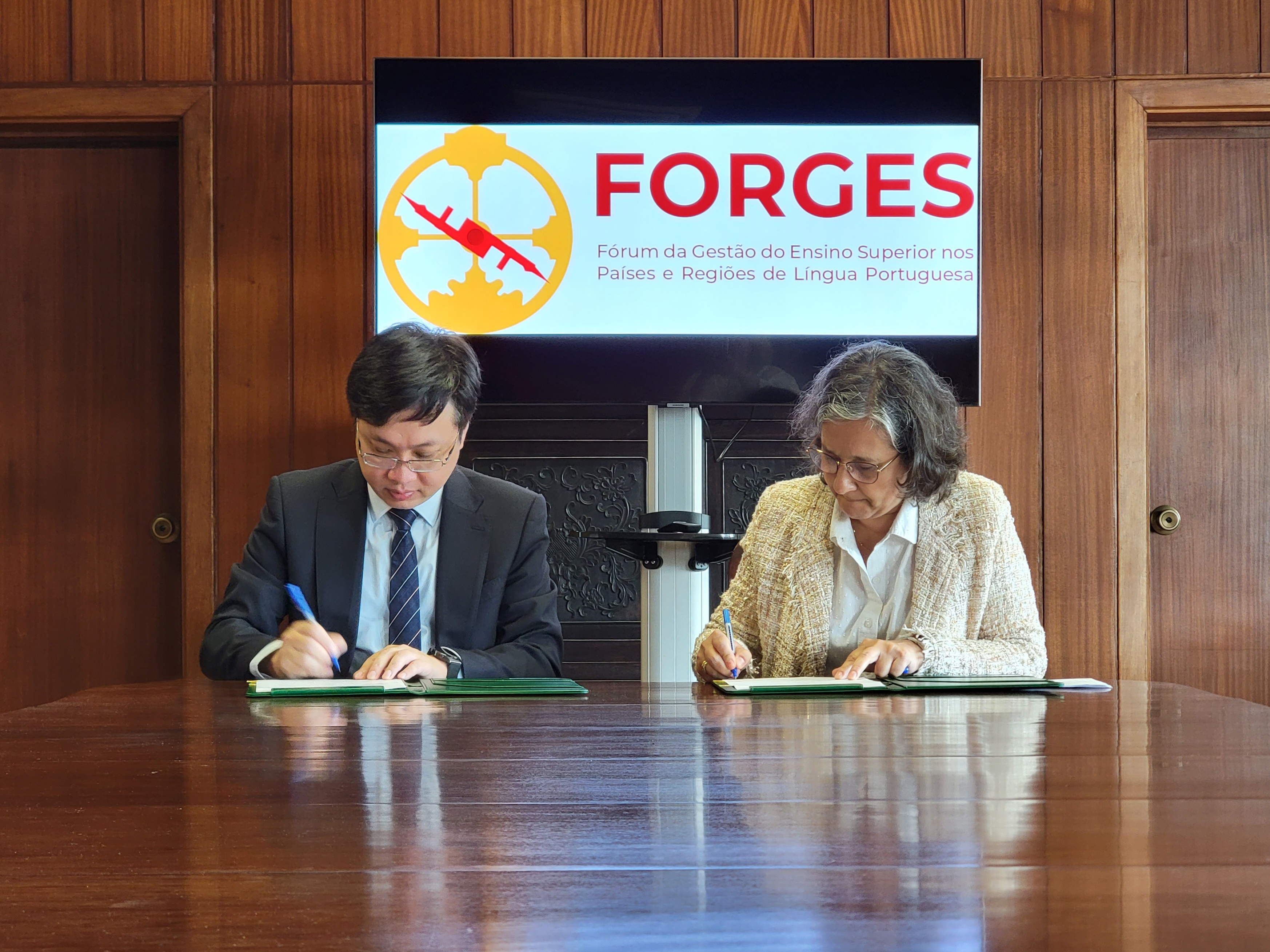 Com vista a desenvolver o papel de Macau como plataforma entre a China e os Países Lusófonos, promover a cooperação do ensino superior entre a China e os Países e Regiões de Língua Portuguesa, e promover a cooperação no intercâmbio académico Luso-Chinês na Área da Grande Baía Guangdong-Hong Kong-Macau, a Universidade Politécnica de Macau (UPM) e o Fórum da Gestão do Ensino Superior nos Países e Regiões de Língua Portuguesa (FORGES) celebraram um acordo de cooperação, no dia 24 de Maio, de manhã (hora local), em Lisboa, Portugal, firmado com a assinatura dos seus representantes, nomeadamente o Reitor da UPM, Im Sio Kei, e o membro da presidência do FORGES, Maria da Conceição Peixe Rego. Este acordo visa promover, em conjunto, o desenvolvimento das ciências, realizar investigação de inovação colaborativa, formar quadros profissionais e desenvolver projectos científicos e tecnológicos.