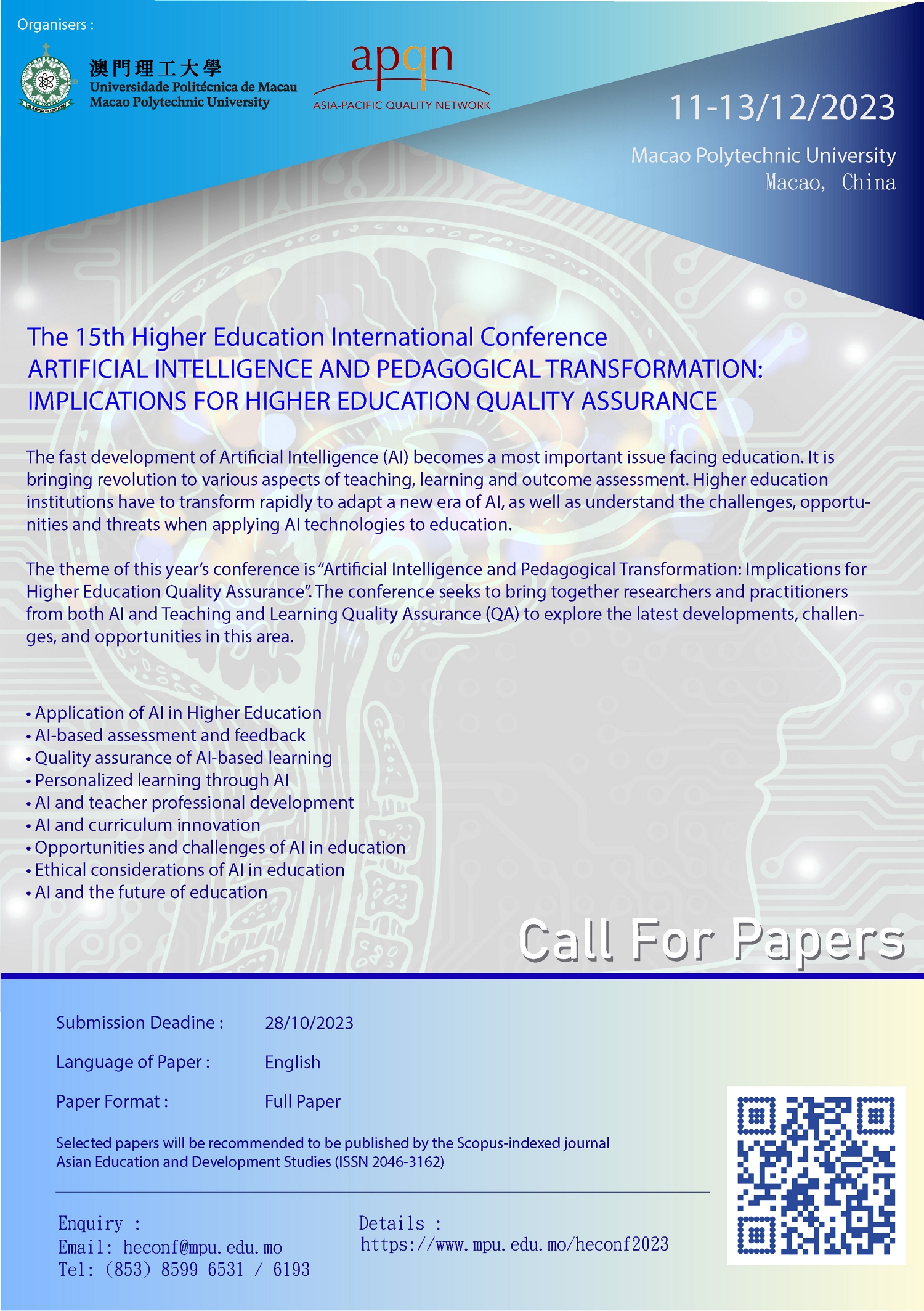 Esta edição da Conferência, que decorrerá entre os dias 11 e 13 de Dezembro de 2023, na Universidade Politécnica de Macau, tem como tema “Inteligência Artificial e Transformação Pedagógica: Implicações para a Garantia da Qualidade do Ensino Superior”, construindo desta forma uma plataforma de intercâmbio entre as instituições de ensino superior e os académicos de Macau e do resto do mundo. O tema vai abordar vários assuntos relevantes, entre os quais: a “aplicação da inteligência artificial no ensino superior”, a “avaliação e o feedback baseados na inteligência artificial”, a “garantia da qualidade da aprendizagem baseada na inteligência artificial”, a “aprendizagem personalizada através da inteligência artificial”, a “inteligência artificial e o desenvolvimento profissional dos professores e inovação curricular”, as “oportunidades e desafios da inteligência artificial na área da Educação e considerações éticas”, a “inteligência artificial e o futuro da Educação”.