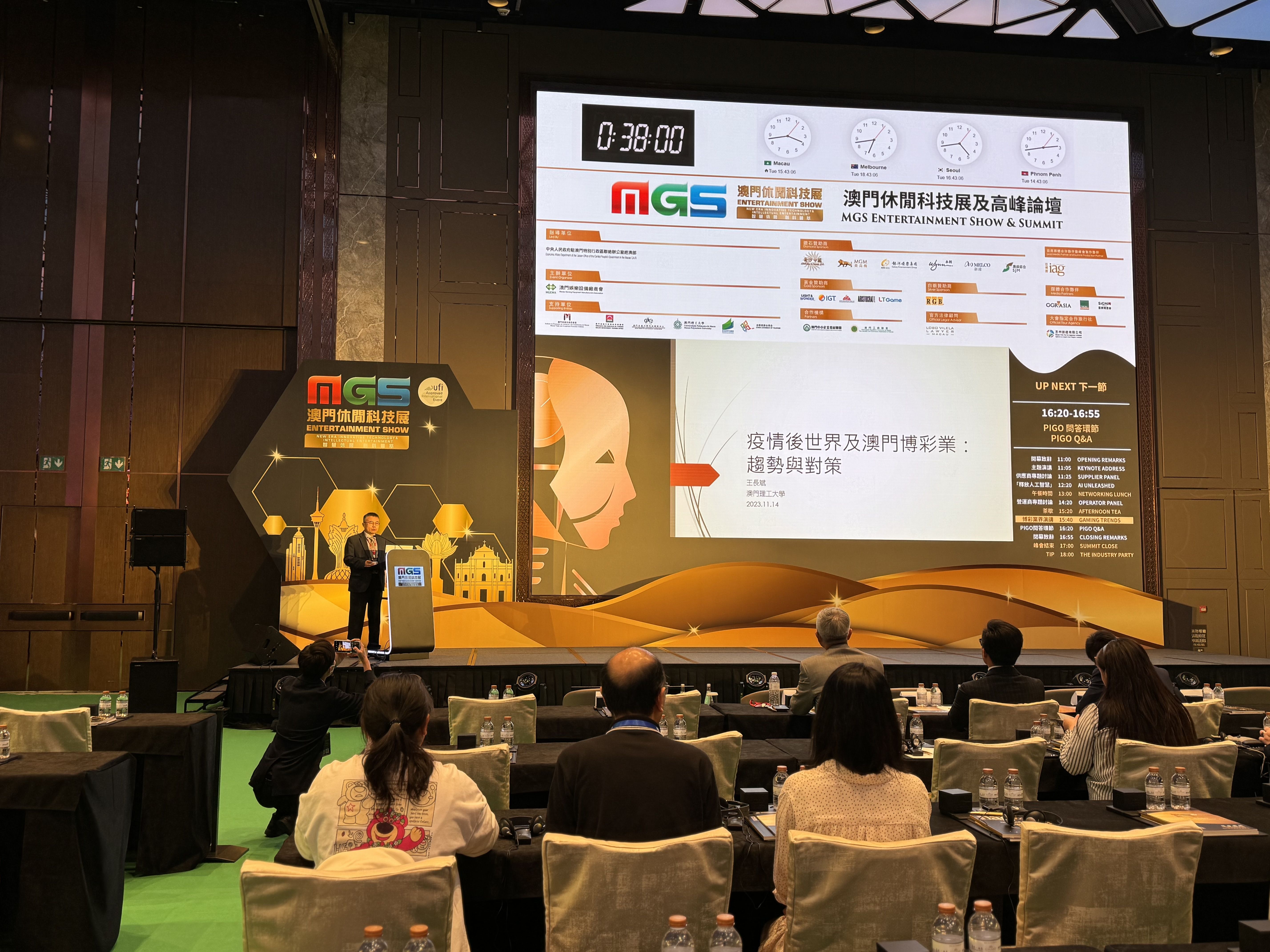 Durante a “Cimeira da MGS Entertainment Show 2023”, que se realizou em simultâneo, o Coordenador do Centro Pedagógico e Científico nas Áreas do Jogo e do Turismo da UPM, Wang Changbin, proferiu um discurso sobre as “Tendências do desenvolvimento da indústria do jogo no mundo e em Macau após a epidemia”, durante o qual partilhou as mudanças no modelo de mercado com académicos do Interior da China e do estrangeiro, profissionais do sector e empresários locais de turismo e lazer integrado, tendo apresentado também relatórios sobre o desenvolvimento do sector e a formação de quadros qualificados.