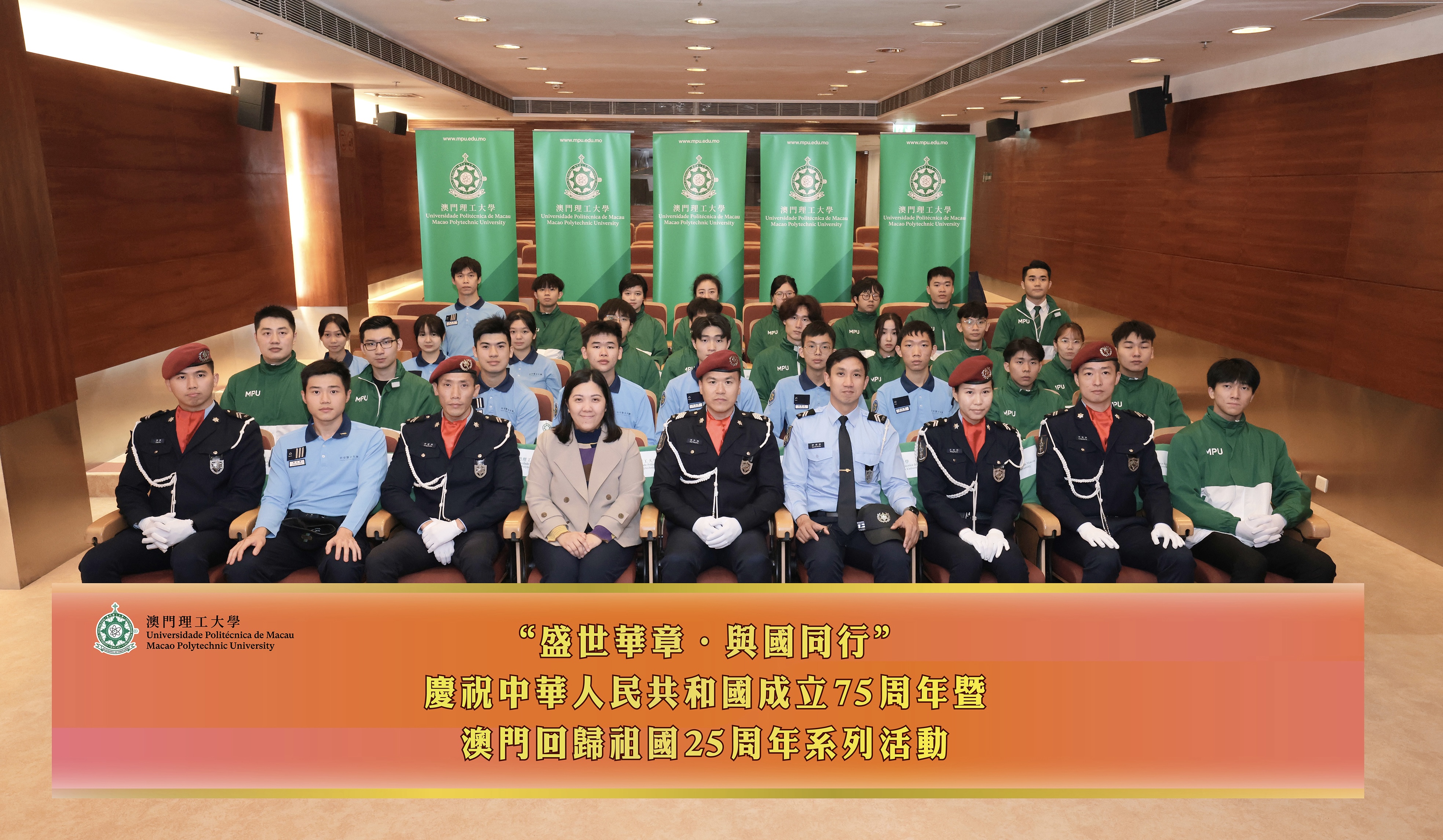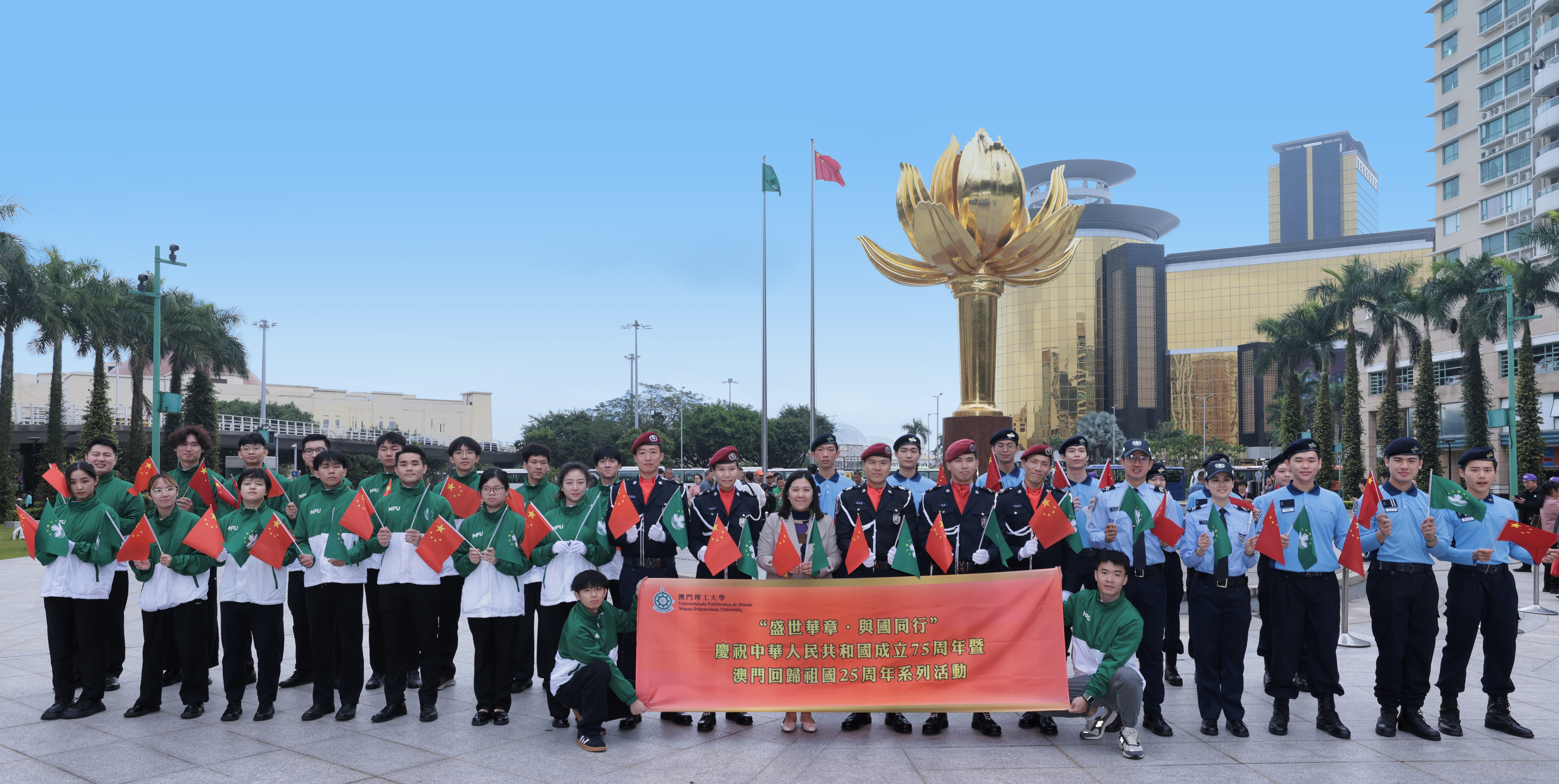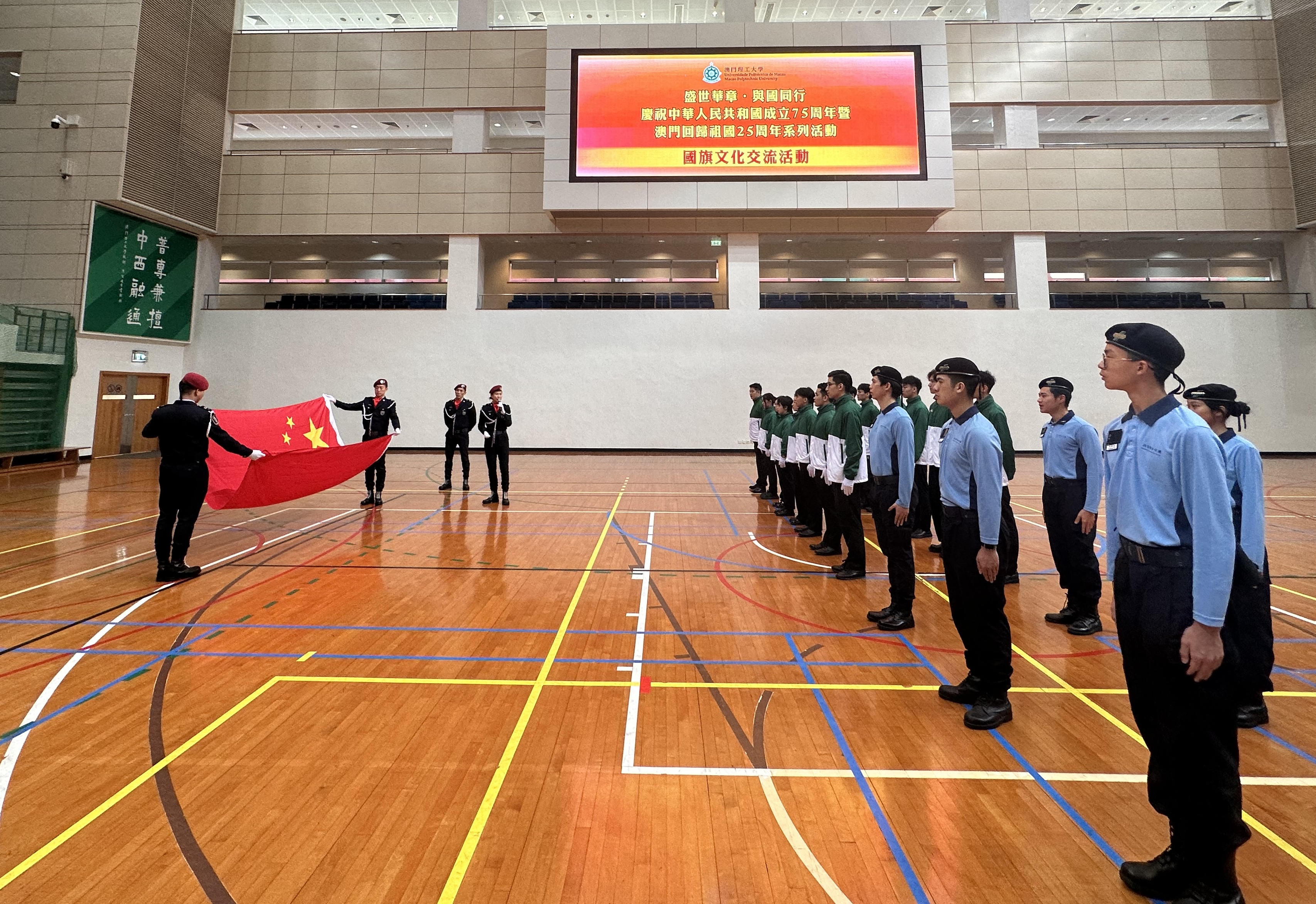 Para comemorar o 75.º Aniversário da Implantação da República Popular da China e o 25.º Aniversário do Retorno de Macau à Pátria, a Divisão de Assuntos de Estudantes da Universidade Politécnica de Macau (DAE-UPM) organizou uma actividade de intercâmbio cultural sobre a Bandeira Nacional, intitulada “Caminhar com o País na Época de Prosperidade Chinesa”, a qual fez parte também da série das actividades de celebração. Para o evento, foram convidados o grupo encarregado do içar das bandeiras da Unidade Especial de Polícia do Corpo de Polícia de Segurança Pública (UEP-CPSP) e o Grupo Júnior do CPSP para procederem ao intercâmbio com a Guarda de Honra da Bandeira Nacional da UPM, demonstrando os procedimentos do içar das bandeiras e as marchas, de modo a transmitir em conjunto o espírito de amor à Pátria e a Macau, celebrando conjuntamente a “dupla celebração”.
