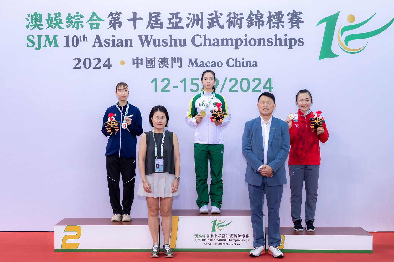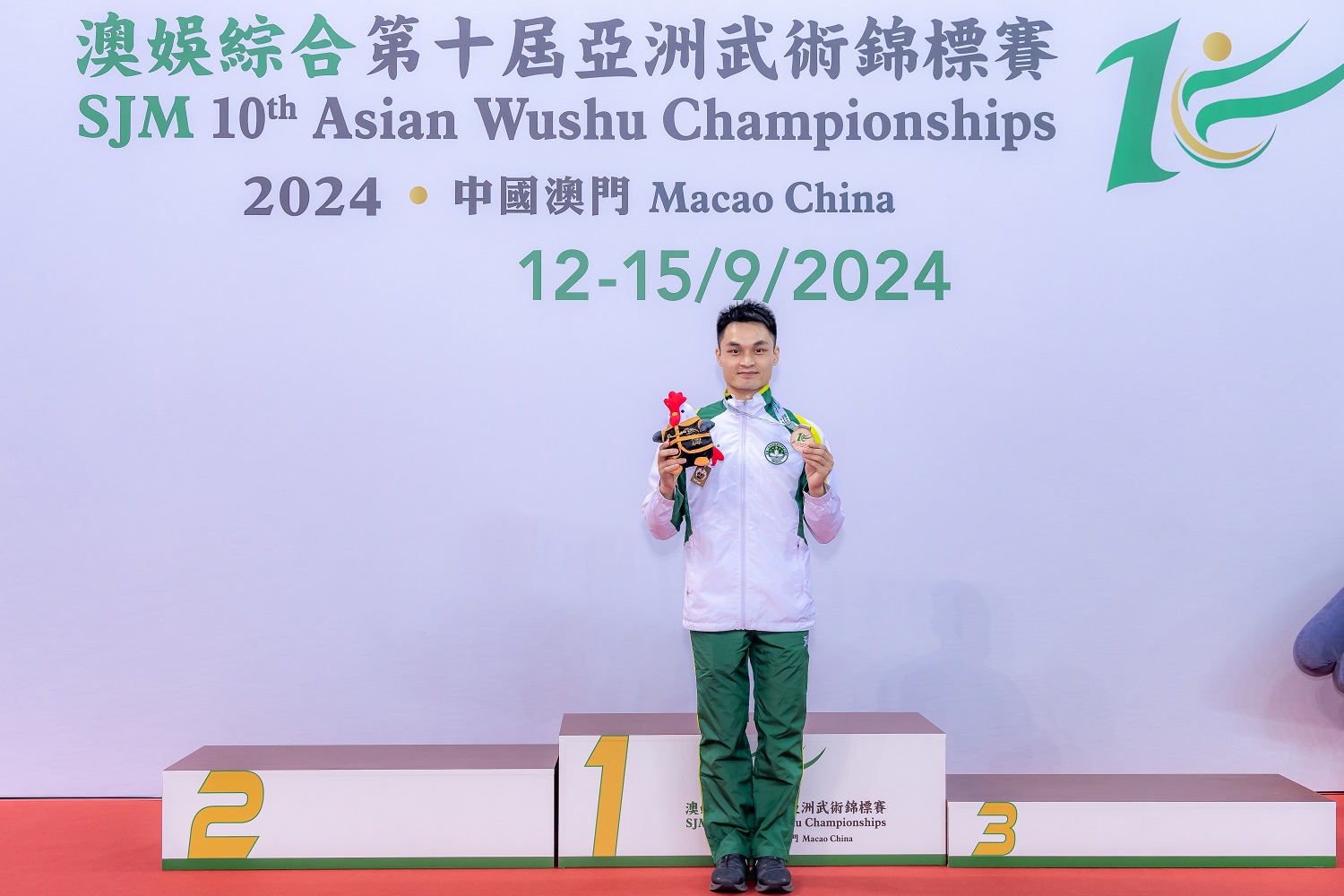 Kuong Chi Hin, aluno do Curso de Licenciatura em Ensino de Educação Física, conquistou uma medalha de prata na modalidade masculina de Qiangshu e outra na modalidade masculina de Jianshu com 9,693 pontos. Após os resultados de uma medalha de ouro e uma de bronze no “Campeonato Universitário da Ásia de Wushu” em Junho do corrente ano, ganhou com sucesso mais duas medalhas de prata no 10.º Campeonato Asiático de Wushu. Wong Weng Ian, também aluna do Curso de Licenciatura em Ensino de Educação Física, ganhou uma medalha de bronze com 9,67 pontos na modalidade feminina de Qiangshu, utilizando novo Qiangshu Taolu, conseguindo mais um sucesso após o “Campeonato Universitário da Ásia de Wushu”.