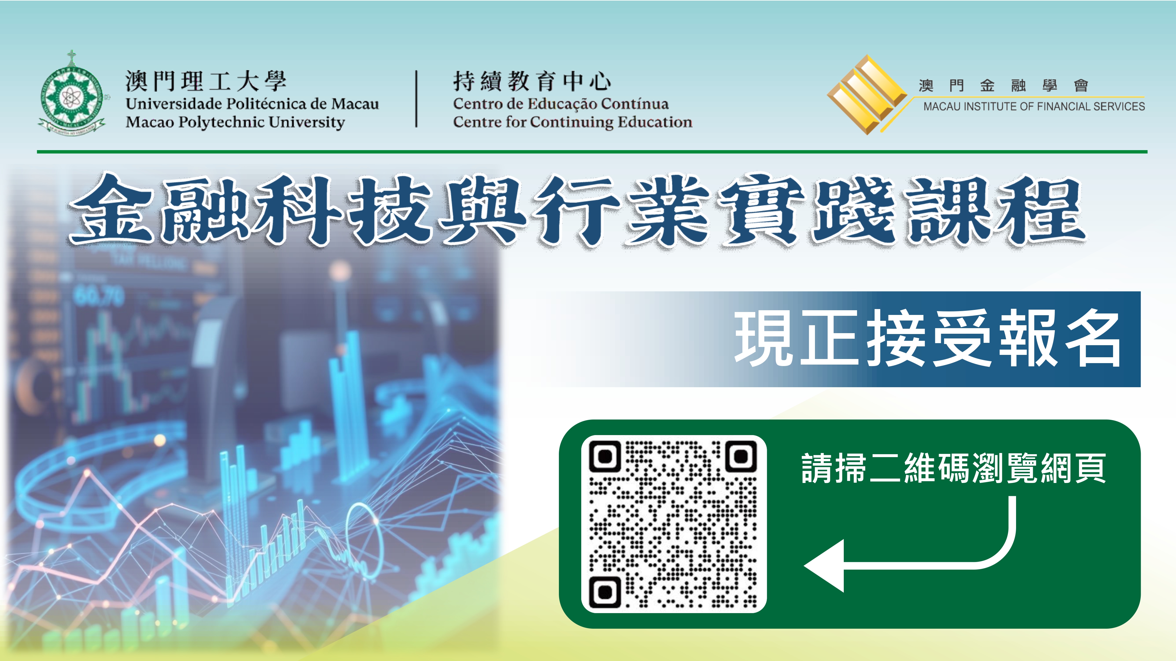 O surgimento da tecnologia financeira trouxe novas oportunidades e desafios às indústrias tradicionais, tais como a banca, os títulos e os seguros. A fim de ajudar os profissionais financeiros e os interessados a dominarem os mais recentes conhecimentos e competências práticas da tecnologia financeira, o Centro de Educação Contínua da Universidade Politécnica de Macau (CEC-UPM) e o Instituto de Formação Financeira de Macau co-organizaram, pela primeira vez, o “Curso de Tecnologia Financeira e Prática Profissional”, que terá início a 12 de Março, sendo bem-vinda a inscrição de todos os interessados.