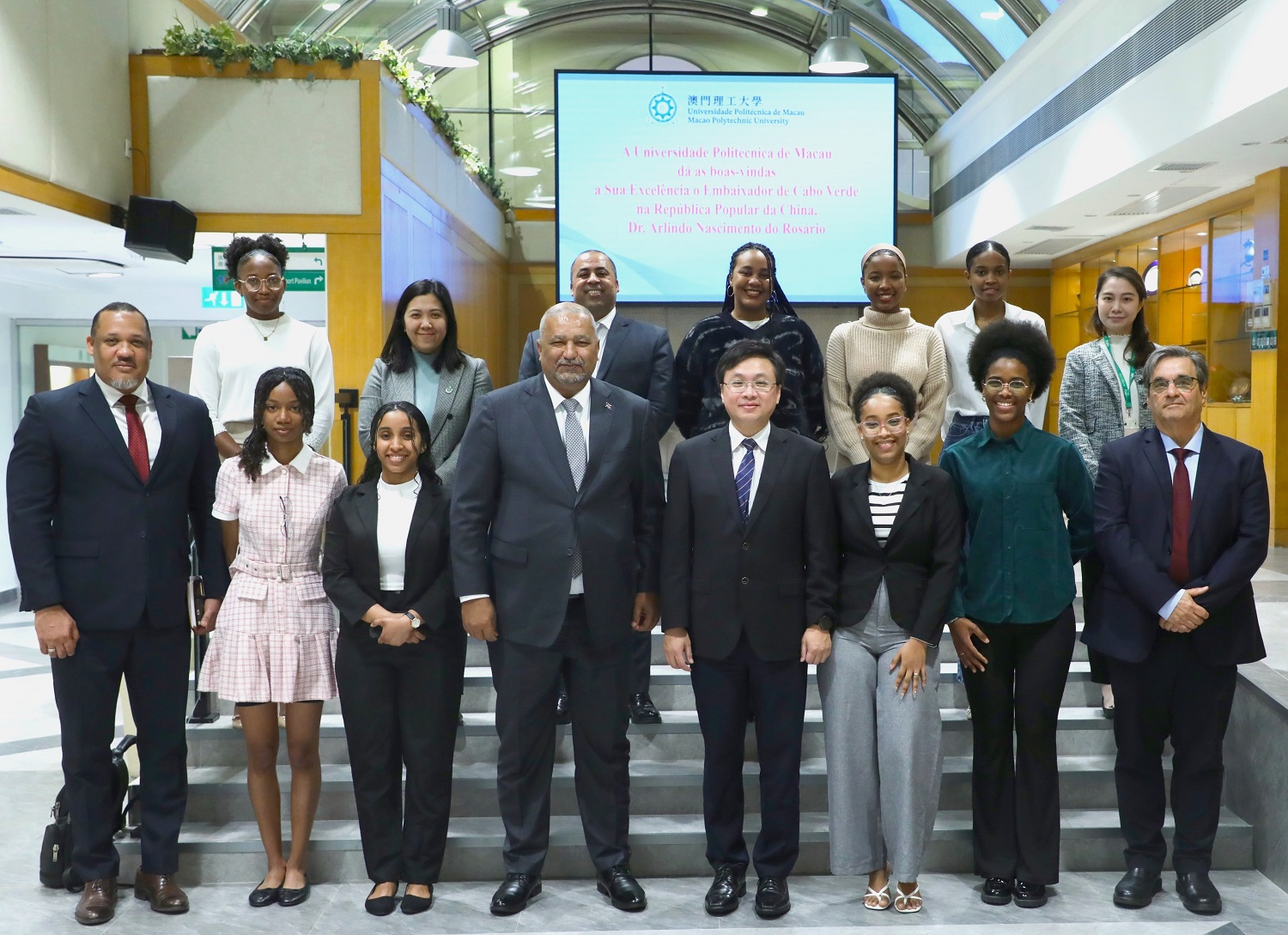 Durante a visita, o Embaixador Arlindo Nascimento do Rosário e a sua delegação tiveram um intercâmbio agradável com os alunos cabo-verdianos que estão a frequentar os cursos conferentes de grau na UPM. Estiveram ainda presentes no encontro: por parte da delegação, o Delegado de Cabo Verde junto do Secretariado Permanente do Fórum de Macau, Nuno Miguel Melo Furtado, e o Primeiro Secretário da Embaixada de Cabo Verde em Beijing, Ermixon Jean Carllete Pina Ribeiro; e por parte da UPM, o Coordenador do Curso de Doutoramento em Português da Faculdade de Línguas e Tradução, Joaquim Carvalho, a Chefe da Divisão de Assuntos de Estudantes, Alice Lao, e a Chefe Substituta do Gabinete de Relações Públicas, Ella Sio.