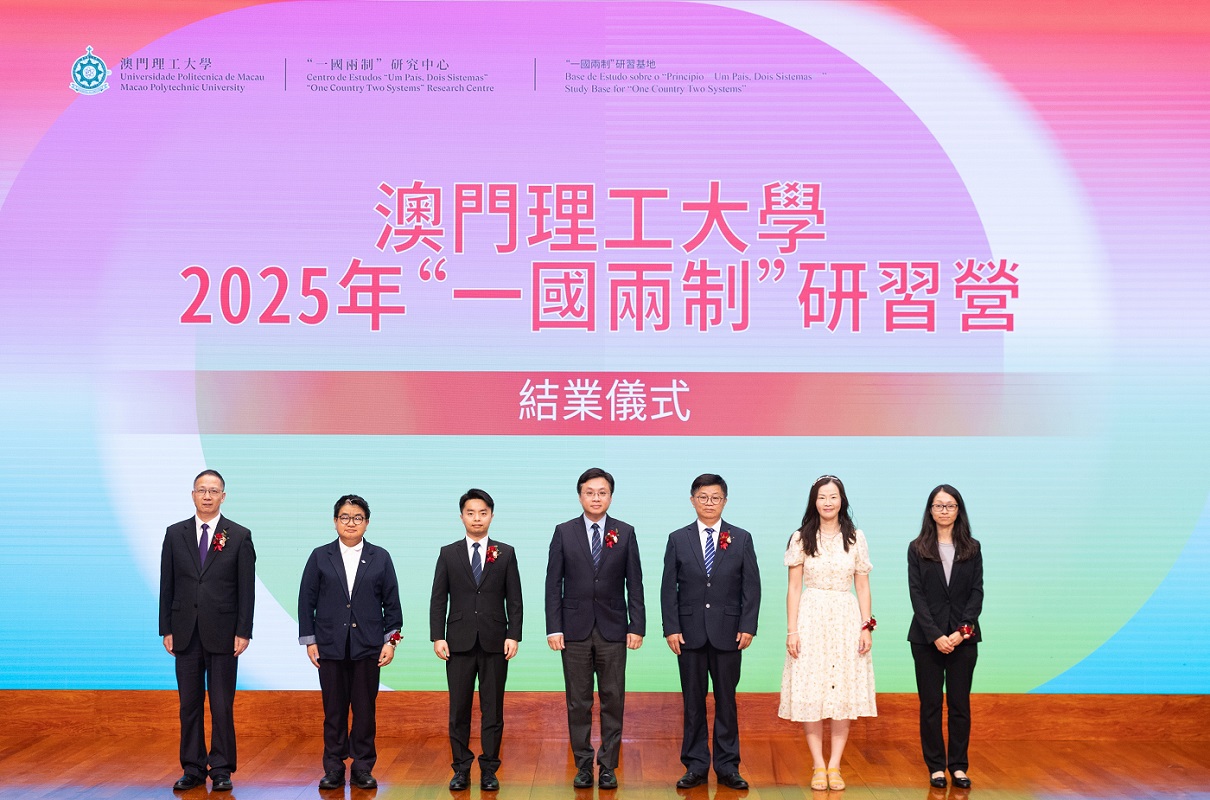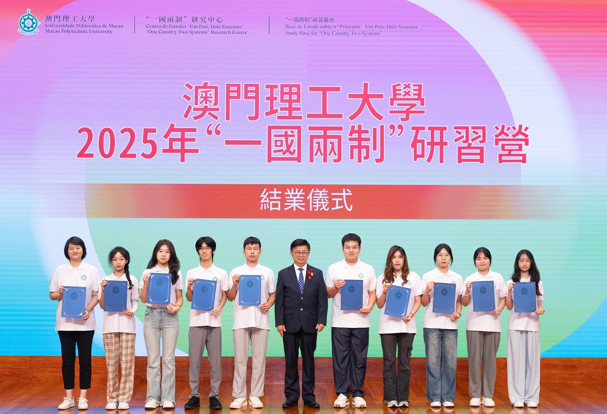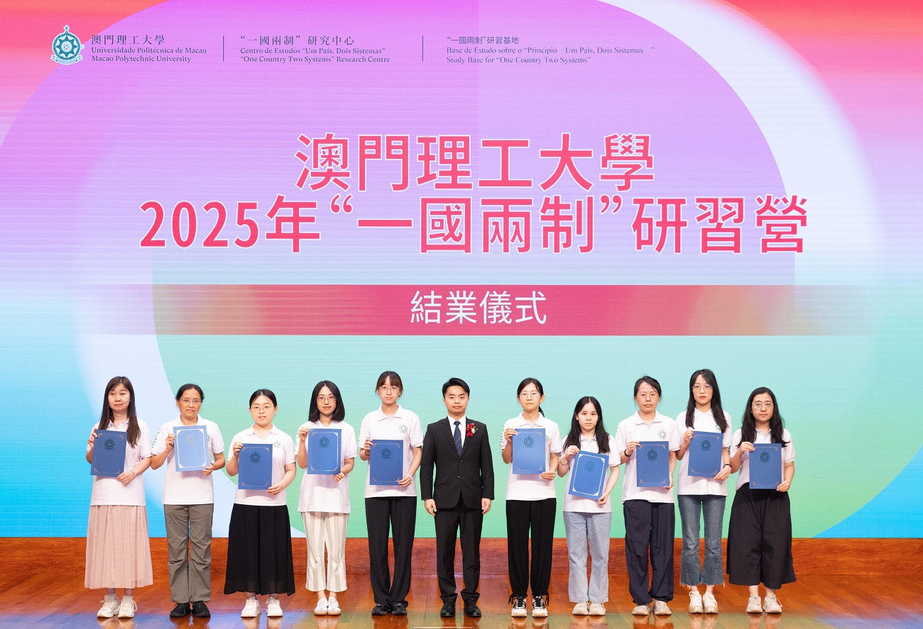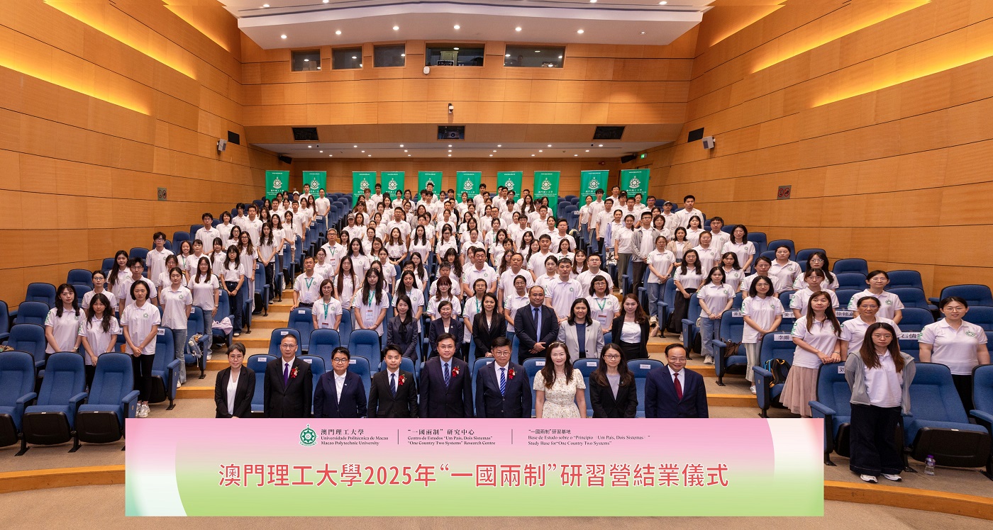 Para que os professores e alunos das instituições de ensino superior do Interior da China conheçam melhor a situação da implementação bem-sucedida do princípio “Um País, Dois Sistemas” com as características de Macau e possam sentir pessoalmente o desenvolvimento de Macau após o retorno à Pátria, a Universidade Politécnica de Macau (UPM) organizou o Campo de Estudo “Um País, Dois Sistemas”, que foi muito bem recebido. A Cerimónia de Encerramento do Campo de Estudos “Um País, Dois Sistemas” de 2025 foi realizada no Auditório da UPM, tendo 153 professores e estudantes de 11 universidades do Interior da China concluído esta jornada de estudos. Os convidados de honra, incluindo o Subdirector da Direcção dos Serviços de Educação e de Desenvolvimento da Juventude do Governo da RAEM, Teng Sio Hong, o Reitor da Universidade Politécnica de Macau, Marcus Im, o Presidente da Associação de Educação de Macau, Cheang Hong Kuong, a Presidente da Direcção da Associação das Escolas Católicas de Macau, Lao Lai Mui, a Presidente da Direcção da Associação Educativa da Função Pública de Macau, Heong Mui, e o Coordenador do Centro de Estudos “Um País, Dois Sistemas” da UPM, Leng Tiexun, entre outros, presidiram a Cerimónia e entregaram certificados de conclusão aos professores e alunos participantes, num ambiente animado.