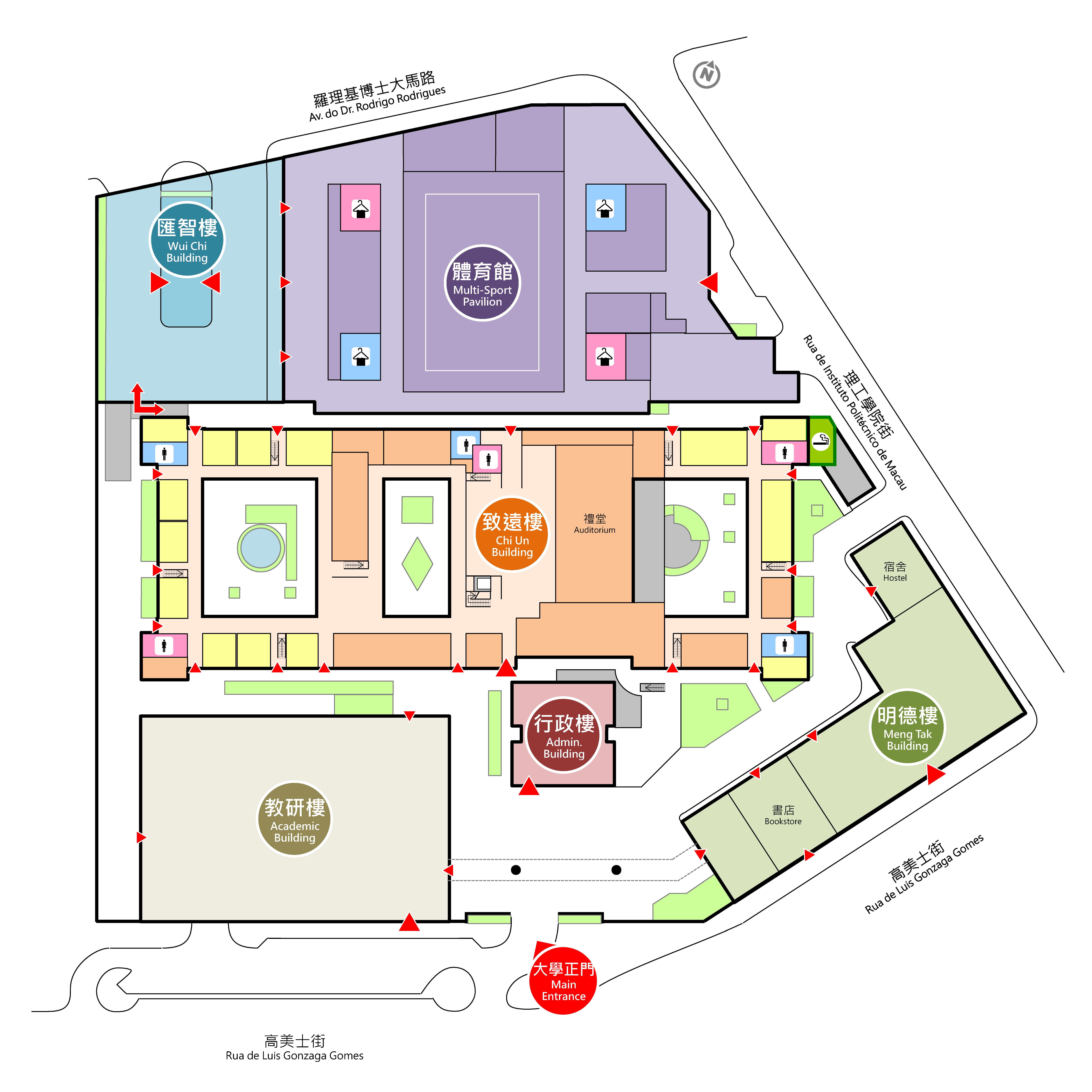 A Universidade Politécnica de Macau dispõe de dois campi sitos, respectivamente, no centro de Macau e no centro da Taipa, permitindo uma maior facilidade de acesso, tanto por meios de transporte como por caminho. Os campi são desenhados com o princípio de “ter por base as pessoas” e prevalece a protecção ambiental. O pessoal da UPM e as visitantes podem deslocar-se a pé a diversos sítios no campus.