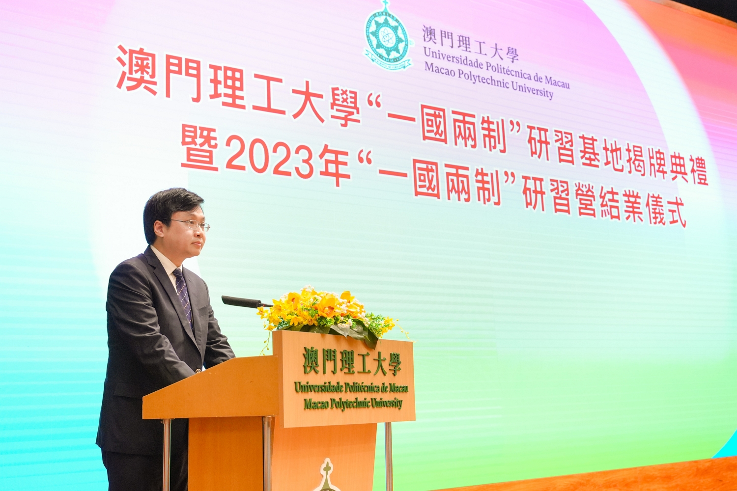 In order to cooperate with the policy implementation of the Macao SAR government, deepen the policy plan of education of “loving the motherland and loving Macao”, promote quality development of an integrated tourism and leisure industry, and enrich the connotation of Macao as a world tourism and leisure centre, the “One Country Two Systems” Study Base of Macao Polytechnic University (MPU) grand inauguration was held at the University at 10 am on 15th July 2023. The Study Base aims to cultivate patriotism in youth on all fronts, develop national education and tourism in a synergistic manner, and play the role of linking cross-disciplinary fields in an interlocking mechanism.