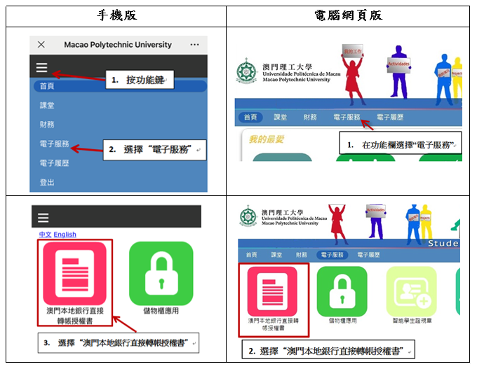 1. 在功能列中選擇“電子服務(eServices),再點擊“澳門本地銀行直接轉帳授權書(Local Macao Bank Transfer Authorization Form),見下圖。