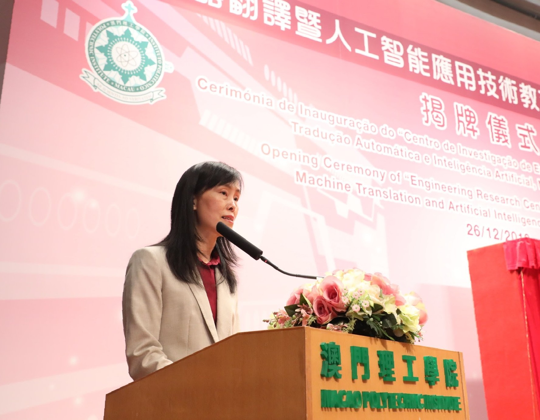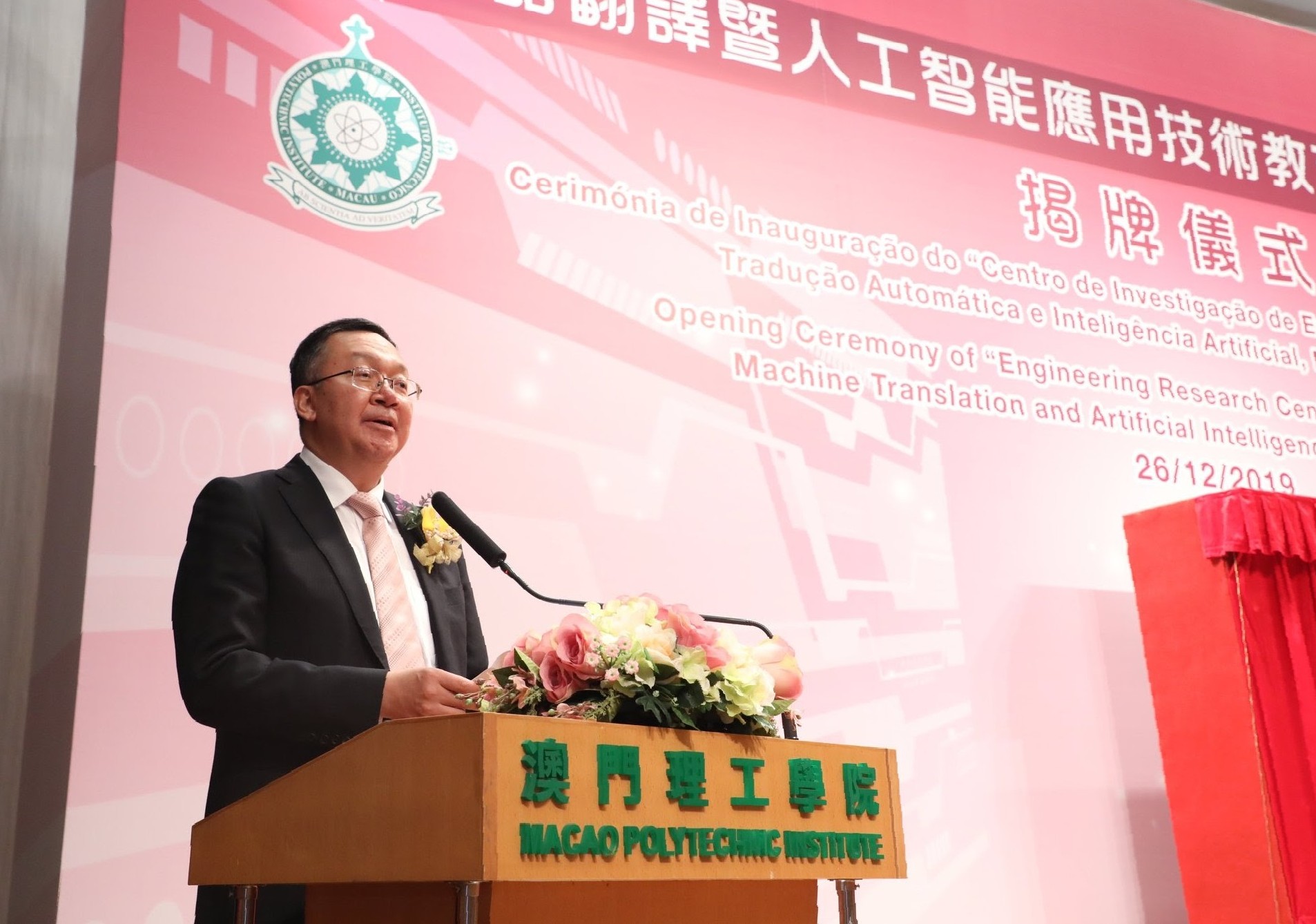 O Centro de Investigação de Engenharia em Tecnologia Aplicada à Tradução Automática e Inteligência Artificial, Ministério da Educação (designado abreviadamente por "Centro"), foi inaugurado a 26 de Dezembro de 2019 na Universidade Politécnica de Macau (UPM), contando com a presença do Dr. Tian Xuejun, Vice-Ministro do Ministério da Educação da República Popular da China e Director da Comissão Estatal de Línguas; da Dra. Ao Ieong U, Secretária para os Assuntos Sociais e Cultura do Governo da RAEM; do Dr. Luo Yonggang, Sub-Director do Gabinete de Ligação do Governo Central na RAEM; do Dr. Liu Jin, Director do Gabinete para os Assuntos de Hong Kong, Macau e Taiwan do Ministério da Educação; do Dr. Sou Chio Fai, Director da Direcção dos Serviços do Ensino Superior do Governo da RAEM e do Prof. Im Sio Kei, Reitor da Universidade Politécnica de Macau. O estabelecimento bem-sucedido do Centro demonstra plenamente o elevado reconhecimento da UPM pelo Ministério da Educação e o forte apoio do Estado à participação de Macau no desenvolvimento do Centro Internacional de Ciência e Inovação da Grande Baía Guangdong-Hong Kong-Macau.