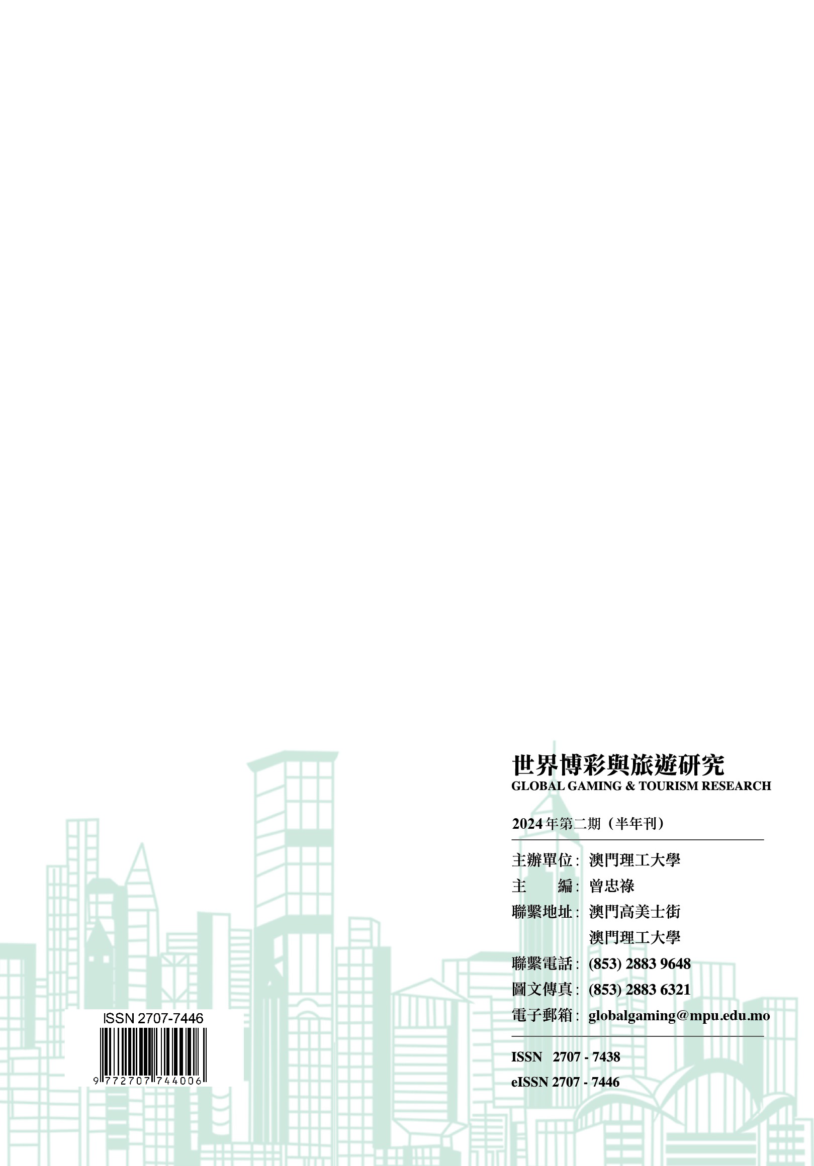 “Global Gaming & Tourism Research” aims to promote the sustainable development of the gaming and tourism industry. In addition to providing support for science-based decision-making across the public and gaming sectors, this academic journal seeks to serve as an exchange platform for gaming and tourism research work. “Global Gaming & Tourism Research” covers such key areas as the development trend of the Macao and global gaming industries, evolution and trend of consumer preference among gaming tourists, responsible gaming theory and practice, tourist behaviour theory and case studies, and tourist destination management theory and practice, etc. Contributions by experts, scholars and industry practitioners are welcome. |