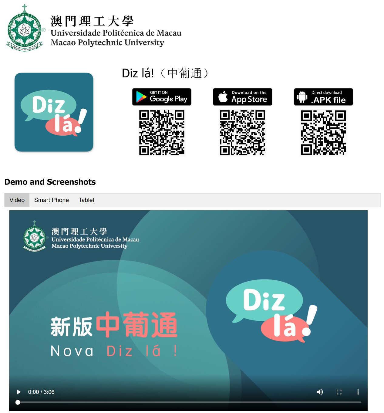 “Diz Lá!中葡通” 手機應用程式是澳門理工大學獨家開發的科研產品。澳理大長期致力於機器翻譯、大數據、人工智能以及大健康等領域的研發,持續推動高等教育創新發展,強化產學研成果轉化,及促進本澳高等教育朝市場化和高品質方向發展,為推動粵港澳大灣區發展及澳門中葡平台建設,發揮其學科優勢。“Diz Lá!中葡通” 手機應用程式依託澳理大在科研技術領域的長期積累,結合其在中葡語言和翻譯教學等領域的豐富經驗,成功實現科研成果的轉化應用。該應用軟件自2018年推出市場以來,廣受社會各界人士、特別是葡語專業高校師生的好評。