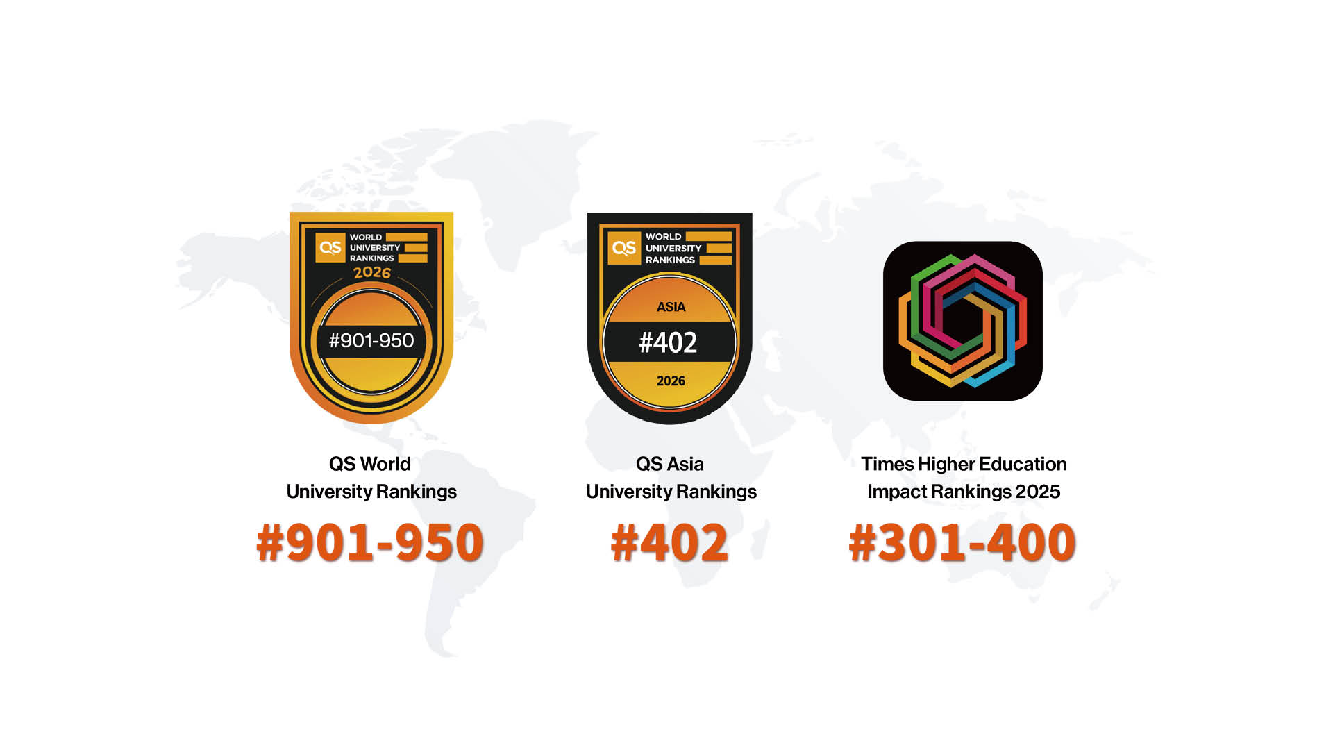 2026年度亞洲大學排名中升至第402位,比去年躍升50位,並自登上該榜單以來,連續三年均有飛躍式進步,在國際高等教育上嶄露頭角。