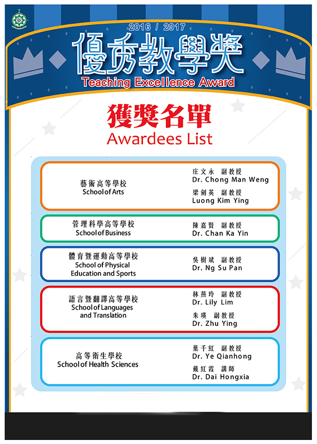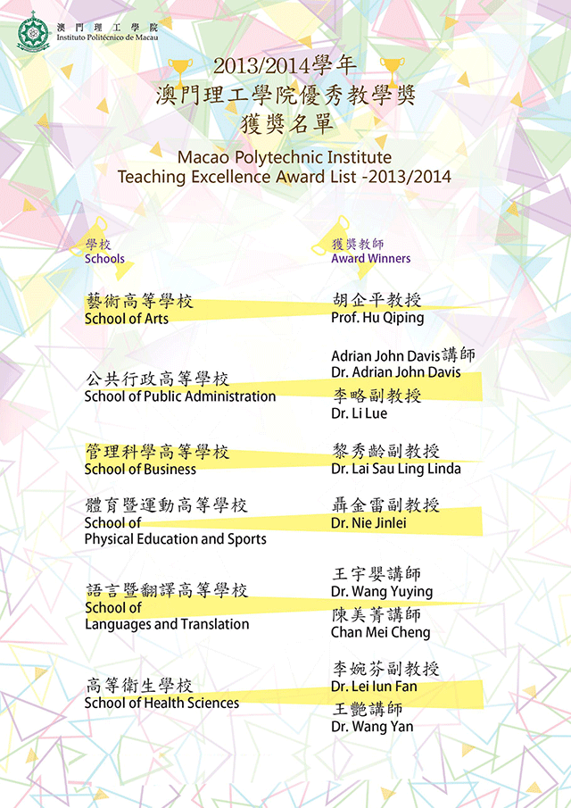 Macao Polytechnic Institute Teaching Excellence Award List – 2008/2009