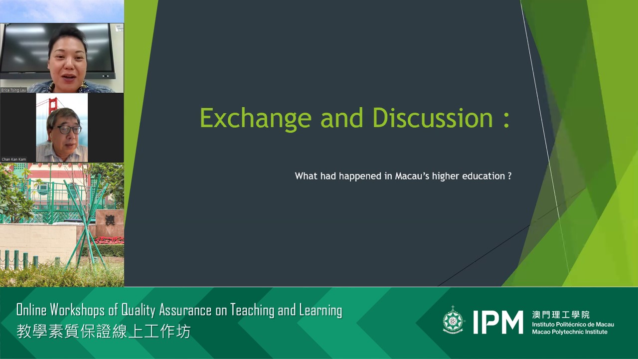 O Instituto Politécnico de Macau (IPM) realizou recentemente duas oficinas de trabalho online sobre a garantia da qualidade de ensino, para os docentes poderem conhecer melhor as exigências do ensino superior e da garantia da qualidade de ensino, de forma a elevar continuamente o nível de ensino deste Instituto. Estas oficinas de trabalho foram orientadas pela Dra. Erica Lau, vice-directora da Academia de Educação Profissional de Po Leung Kuk de Hong Kong, e pelo Dr. Kan Kam Chan, professor adjunto e coordenador do Curso de Licenciatura em Serviço Social do IPM. Os dois eventos atraíram a participação de mais de 100 docentes.
