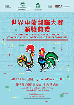《世界中葡翻譯大賽》頒獎禮將於八月九日下午三時正於理工匯智樓一樓一號演講廳舉行,歡迎各大專院校專家學者、師生及有興趣人士參與。詳情請瀏覽比賽網頁:www.ipm.edu.mo/WCPTC或致電8599 3281與主辦單位聯絡。