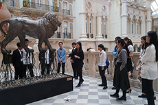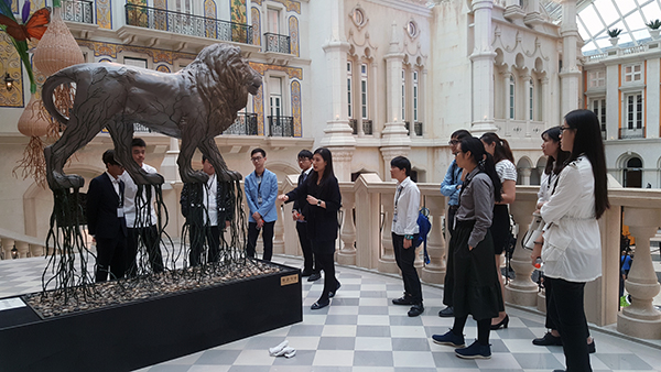 澳門美高梅人員向理工學生介紹其標誌金獅雕像 |