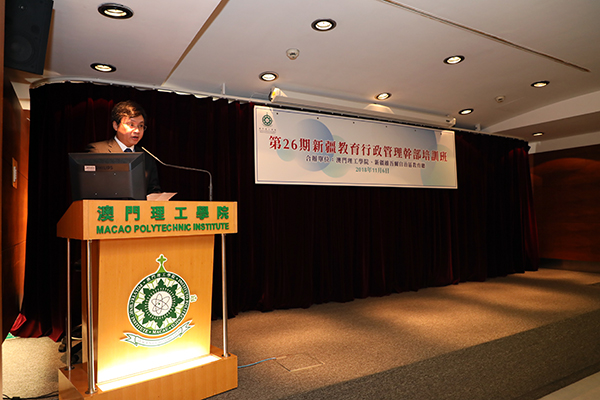 為推動新疆與澳門教育事業的發展和交流,培養教育行政管理人才,澳門理工學院本月六日上午在理工匯智樓演講廳舉行“第二十六期新疆教育行政管理幹部培訓班”開班典禮。理工學院院長嚴肇基、成人教育及特別計劃中心主任林發欽及培訓班團長許新軍,以及來自新疆教育部門二十二名幹部學員等出席了開班儀式。