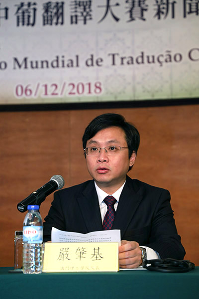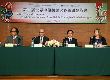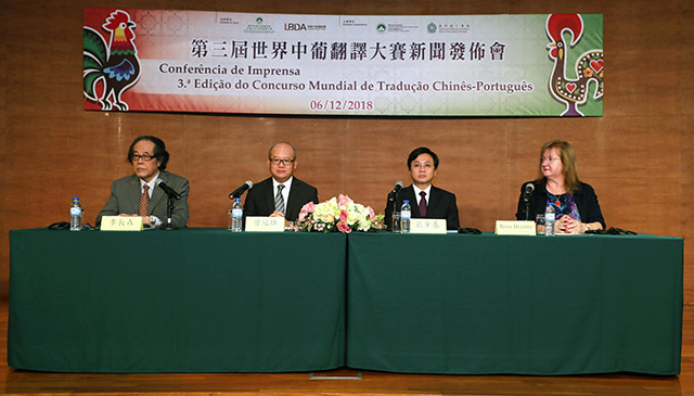 第三屆世界中葡翻譯大賽新聞發佈會12月6日(星期四)下午四時在澳門理工學院舉行,由澳門理工學院院長嚴肇基、高等教育輔助辦公室副主任曾冠雄、第三屆世界中葡翻譯大賽學術委員會主席李長森及澳門理工學院葡語水平測試中心主任Rosa Bizarro主持,介紹比賽章程及詳情。曾冠雄致詞時表示,澳門擁有深厚的葡語文化底蘊,政府一直推廣葡語教學與學習,致力打造成為中葡雙語培訓基地,配合國家“一帶一路”倡議以及與葡語國家的聯繫,冀澳門能成為亞洲的葡語中心。高等教育輔助辦公室將一如以往推動澳門高等教育培養中葡雙語人才,並透過比賽,展現澳門在高教範疇上葡語培訓的實力。嚴肇基介紹澳門理工學院持續圍繞葡語重點學科建設,開設了一系列與葡語專業相關的學位課程,並與內地科研機構及大學合作共建“中葡英機器翻譯聯合實驗室”,研發的“中葡機器翻譯系統”已取得首階段成果,包括建立了全球最大中葡互譯平行語料庫、採用最先進的神經網路機器翻譯技術開發出全球準確度最高的中葡翻譯系統,該系統已於本地落實應用並獲多個本澳政府部門支持,現已簽約應用的部門包括立法會、教育暨青年局、民政總署及財政局,另與多個政府部門在商討合作中;此外,在社會文化司譚俊榮司長的支持下推出的《Diz Lá!》葡語學習手機應用程式,亦獲多個葡語系國家用戶支持及好評。