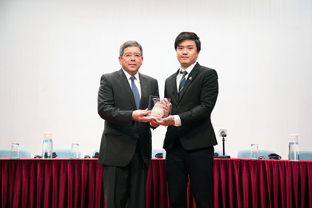 澳門理工學院學生會理事長汪宗雋向運輸工務司司長羅立文致送紀念品