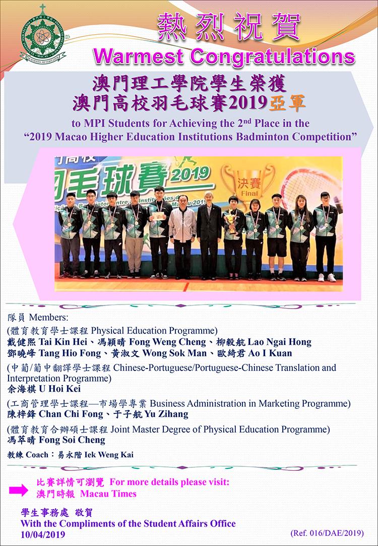 澳門理工學院學生榮獲澳門高校羽毛球賽2019亞軍