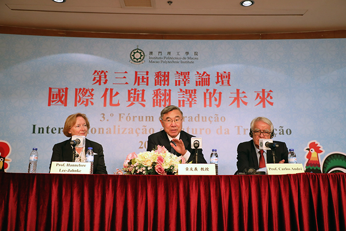 黃友義、Hannelore Lee-Jahnke及Carlos André在澳門理工學院開講國際化與翻譯的未來