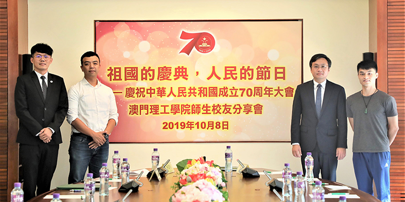 黃俊華(從右至左)、嚴肇基、黃萬鏗及林志超在“祖國的慶典,人民的節日——慶祝中華人民共和國成立70周年大會”澳門理工學院師生校友分享會分享感想 |