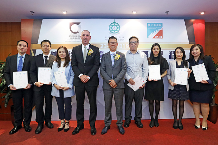 勞工局代局長吳惠嫻 (左六) 向新濠博亞畢業生頒發畢業證書