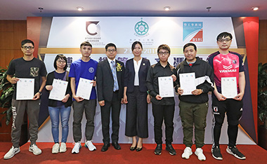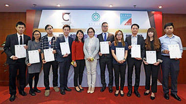 理工學院副院長李雁蓮 (右一) 向澳門娛樂廠商會畢業生頒發畢業證書