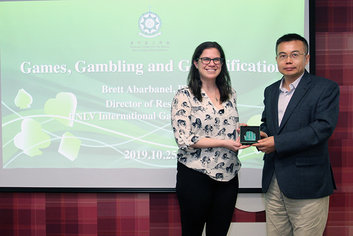 澳門理工學院博彩旅遊教學及研究中心於本月二十五日,在該中心氹仔校部為博彩管理專業學士學位課程舉行博彩範疇專題講座。主講嘉賓為美國內華達大學拉斯維加斯分校國際博彩研究所研究總監佈雷特·阿巴巴內爾(Brett Abarbanel)博士,吸引了近八十名師生出席。