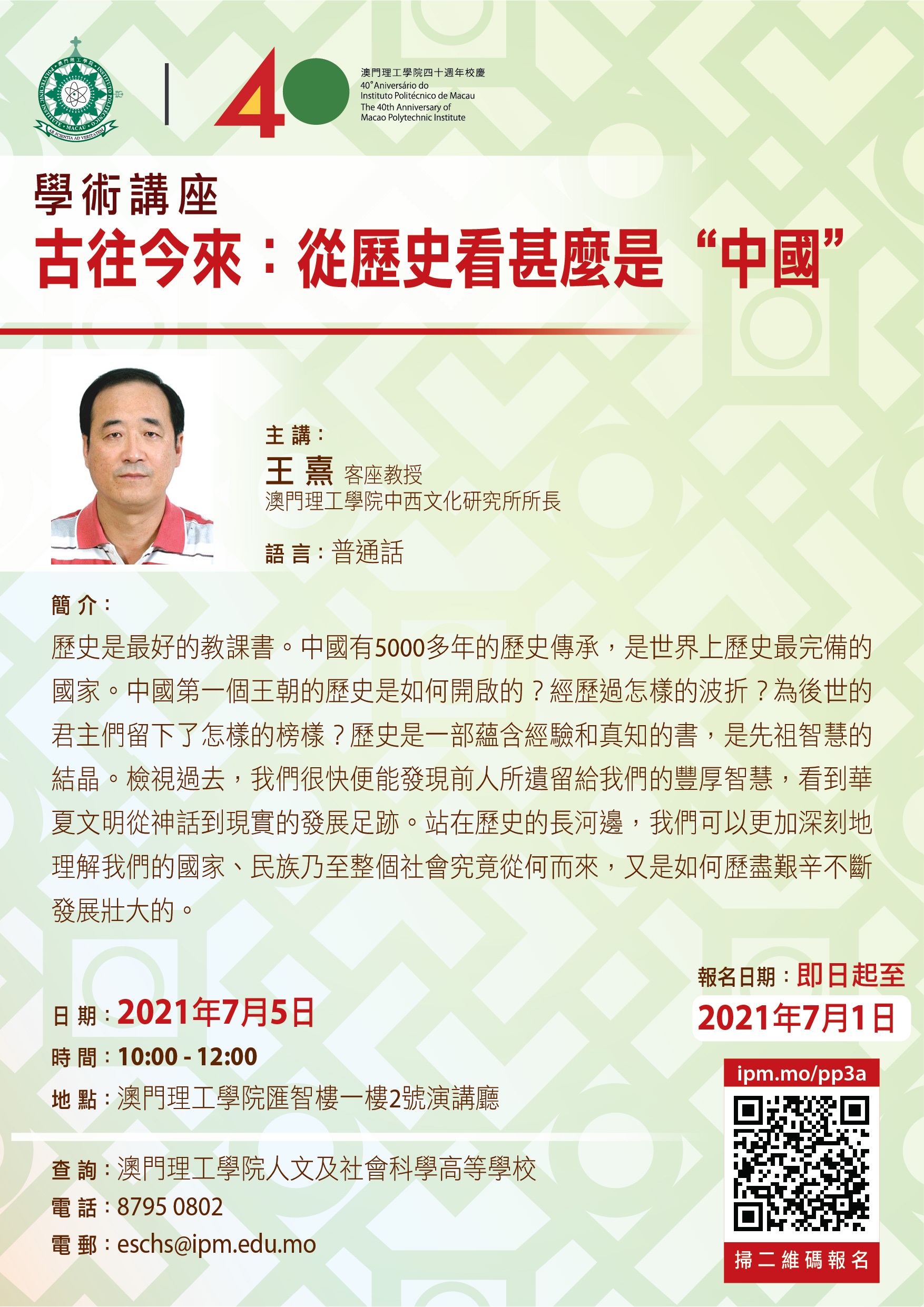 “古往今來:從歷史看甚麼是中國”講座將於7月5日(星期一)上午10時於澳門理工學院匯智樓一樓2號演講廳舉行。報名日期由即日起至7月1日,費用全免,名額有限,額滿即止,歡迎有興趣的人士登入網址:ipm.mo/pp3a或掃描二維碼線上報名。如有垂詢,請於辦公時間內致電87950802,或電郵eschs@ipm.edu.mo與澳門理工學院人文及社會科學高等學校聯繫。