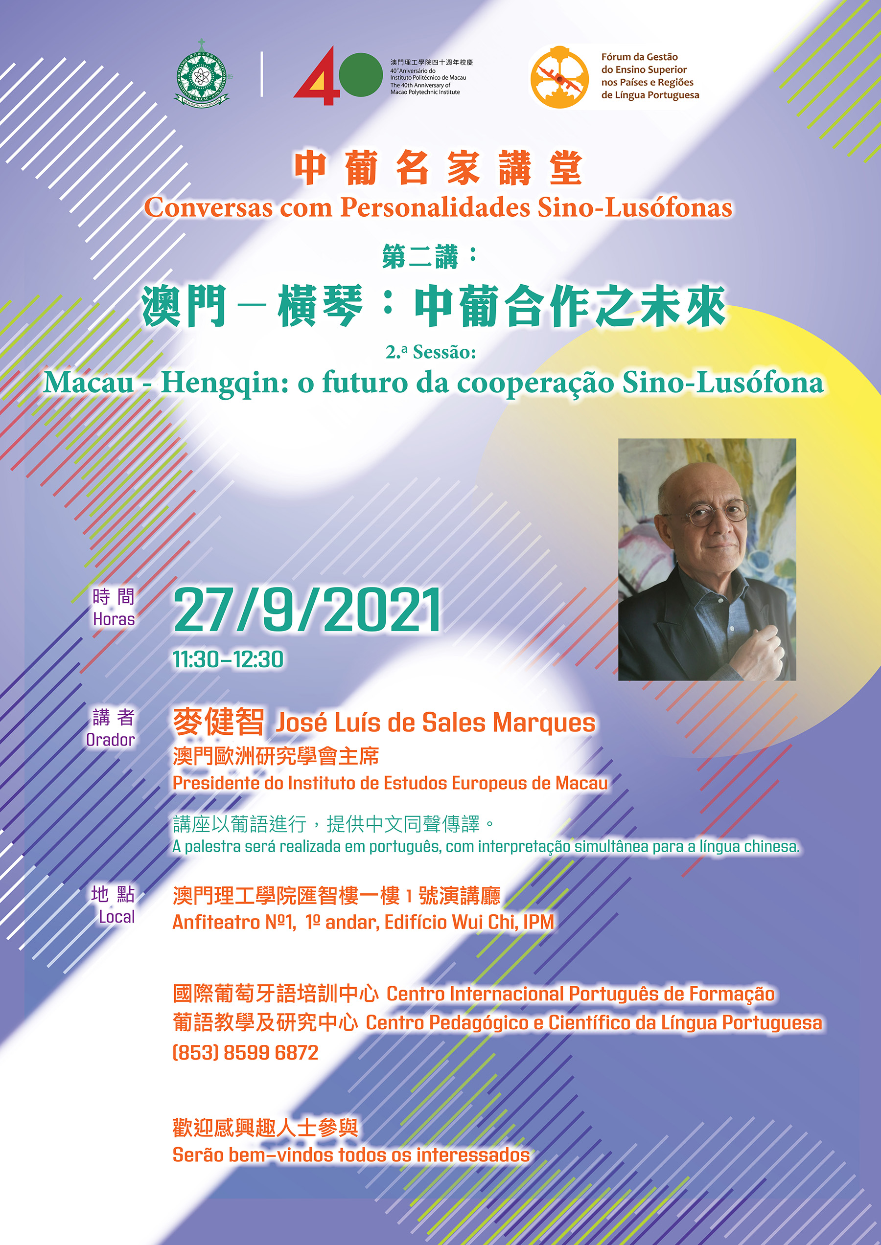 “中葡名家講堂” 第二講 “澳門—橫琴:中葡合作之未來” 將於9月27日上午11:30在澳門理工學院匯智樓一樓1號演講廳舉行,講座將以葡文進行,現場設有中文同聲傳譯。現誠摯邀請各位老師、學生及感興趣人士免費參與。為配合澳門特區政府衛生局的防疫指引,參與活動之人士必須配戴口罩、接受體溫探測,並出示當天有效的個人【澳門健康碼】。如有垂詢,敬請致電8599 6872。
