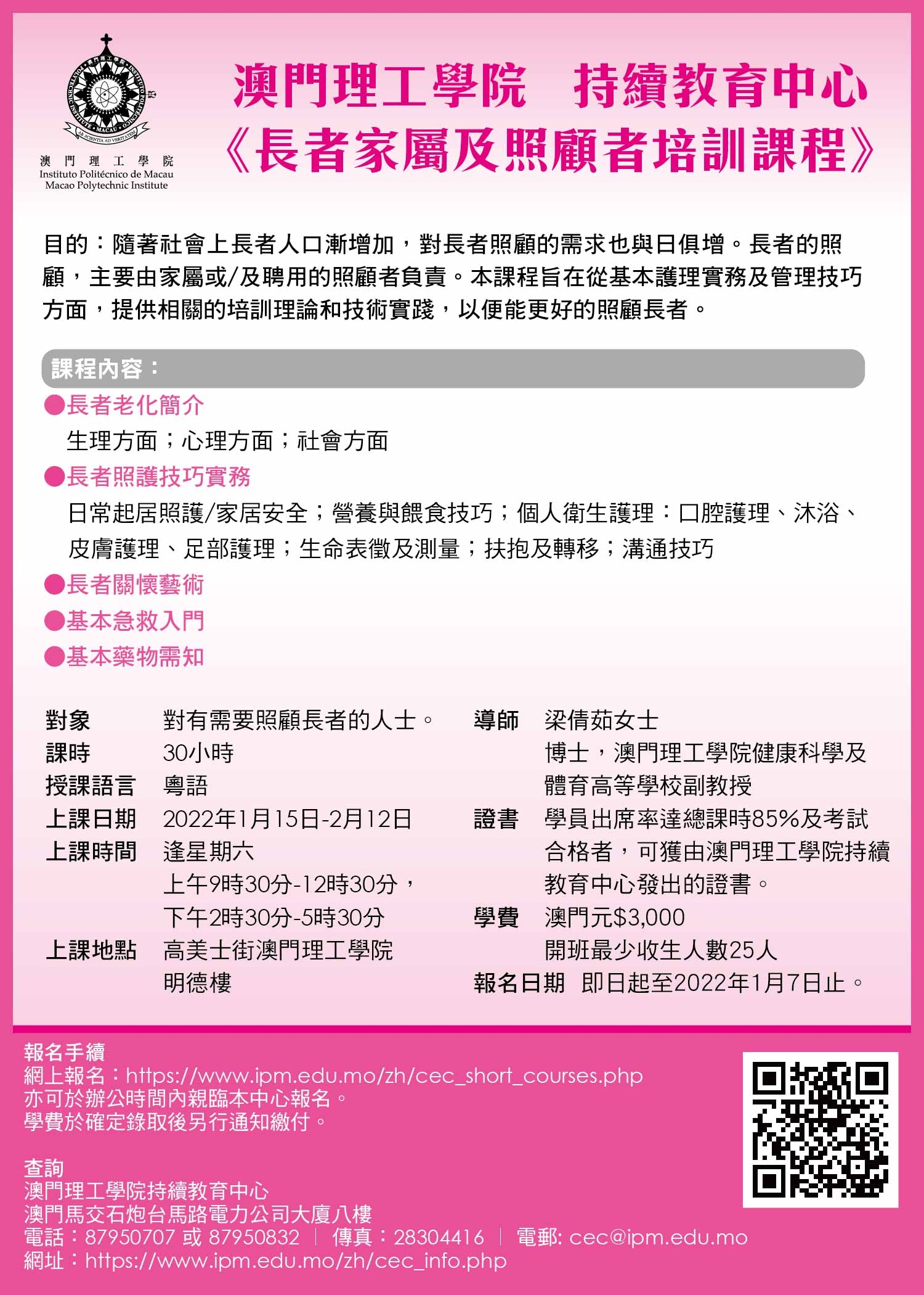 課程日期由二零二二年一月十五日至二月十二日,逢星期六上午九時三十分至十二時三十分,下午二時三十分至五時三十分。課時三十小時,分為理論二十三小時、技術實踐七小時,理論與實踐兼備、粵語授課。課程導師是澳門理工學院健康科學及體育高等學校副教授梁倩茹博士,梁博士在老人/長者護理範疇具有豐富的教學、研究及實務經驗。