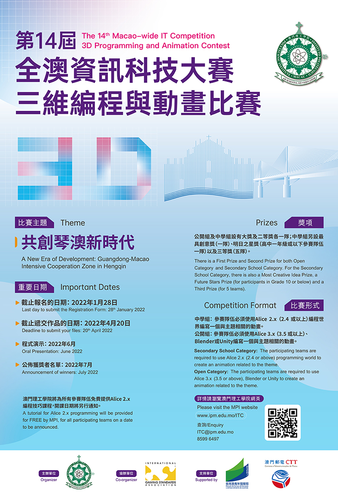 澳門理工學院“第十四屆全澳資訊科技大賽–三維編程與動畫比賽” 現正接受報名 -