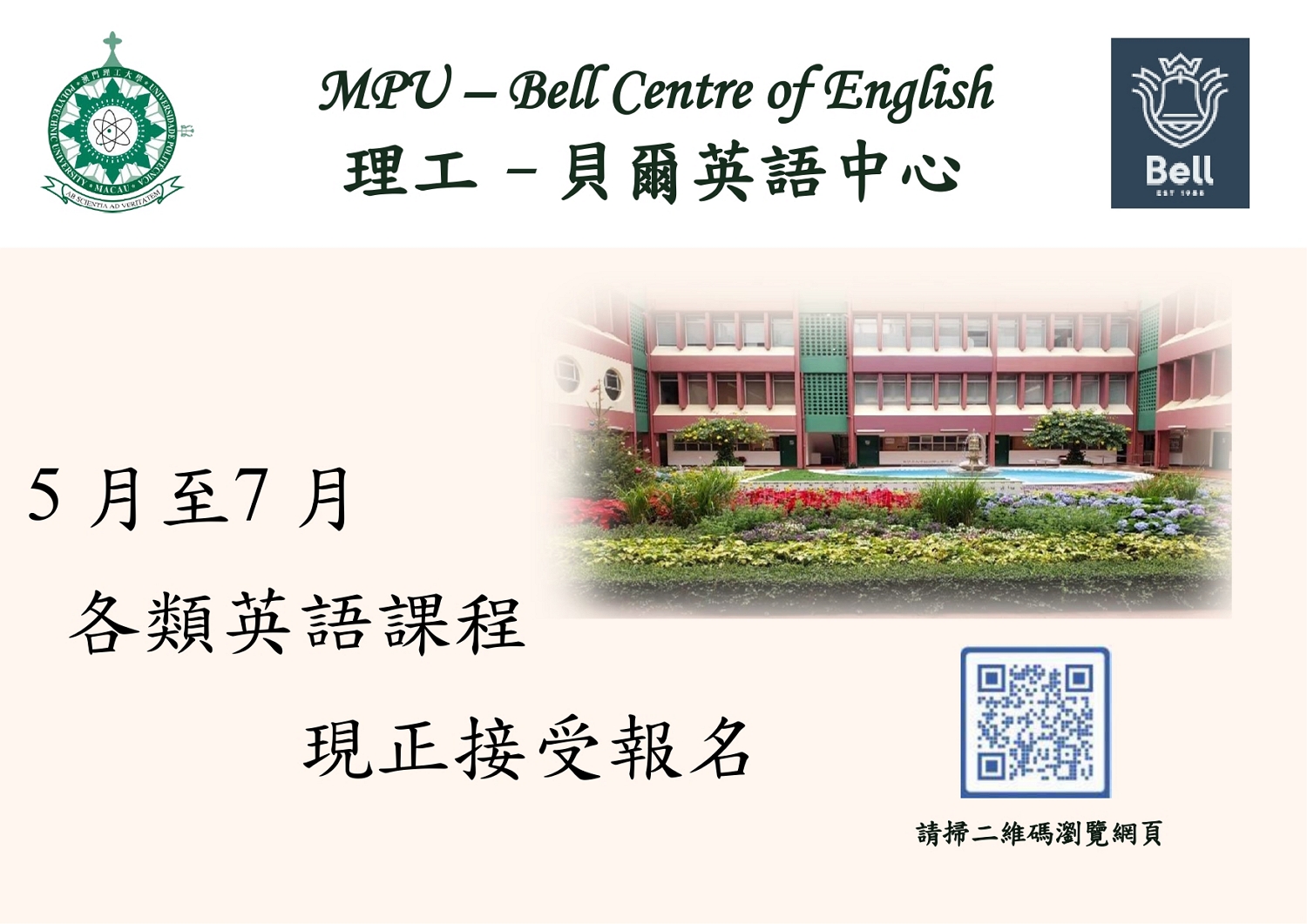 澳門理工大學-貝爾英語中心將於5月至7月推出不同系列的英語學習課程,包括實時網上課程、面授課程及密集課程,內容有留學英語培訓、雅思培訓、英語演講及演示、英語寫作、實用英語課程等。