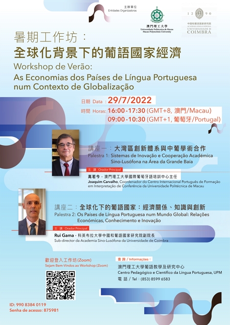 為深入探討全球一體化下葡語國家經濟發展現狀和未來前景,聚焦中國與各葡語國家的經貿往來及戰略合作,進一步探索澳門作為中國與葡語國家商貿合作服務平台的重要作用,澳門理工大學葡語教學及研究中心、國際葡萄牙語培訓中心與科英布拉大學中國和葡語國家研究院將於7月29日聯合舉辦“暑期工作坊:全球化背景下的葡語國家經濟”。工作坊由兩場講座組成,分別由澳門理工大學國際葡萄牙語培訓中心主任高若今(Joaquim Ramos de Carvalho)及科英布拉大學中國和葡語國家研究院副院長魯伊·伽馬(Rui Gama)擔任主講,歡迎各界人士參與。