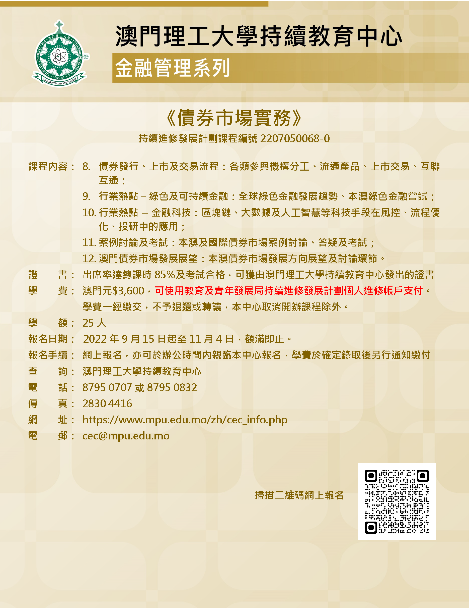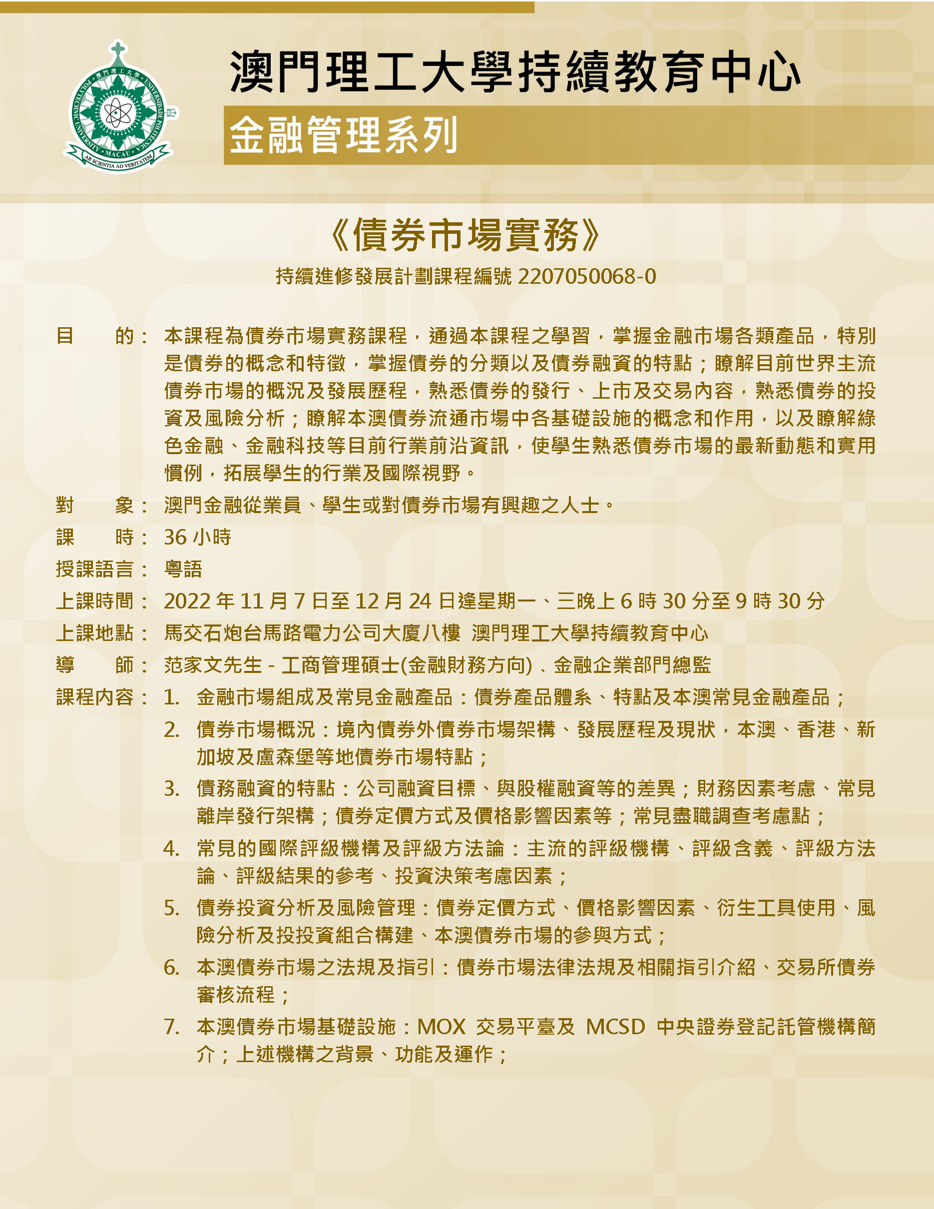 中央政府先後於2019年和今年在澳門發行共50億人民幣國債,體現了中央政府對澳門的持續大力支持,是澳門發展現代金融產業的重要里程碑。澳門政府及業界均認為宜把握契機,通過發展債劵市場加快推動本地經濟多元發展。為配合產業發展,除了需加快完善澳門的金融體系基礎設施,並需及時儲備具相關專業知識的人才資源。為積極回應社會發展所需,及時培養金融產業所需人才,澳門理工大學持續教育中心開辦《債券市場實務》課程,適合金融從業人員以及對債券市場感興趣的人士報讀。