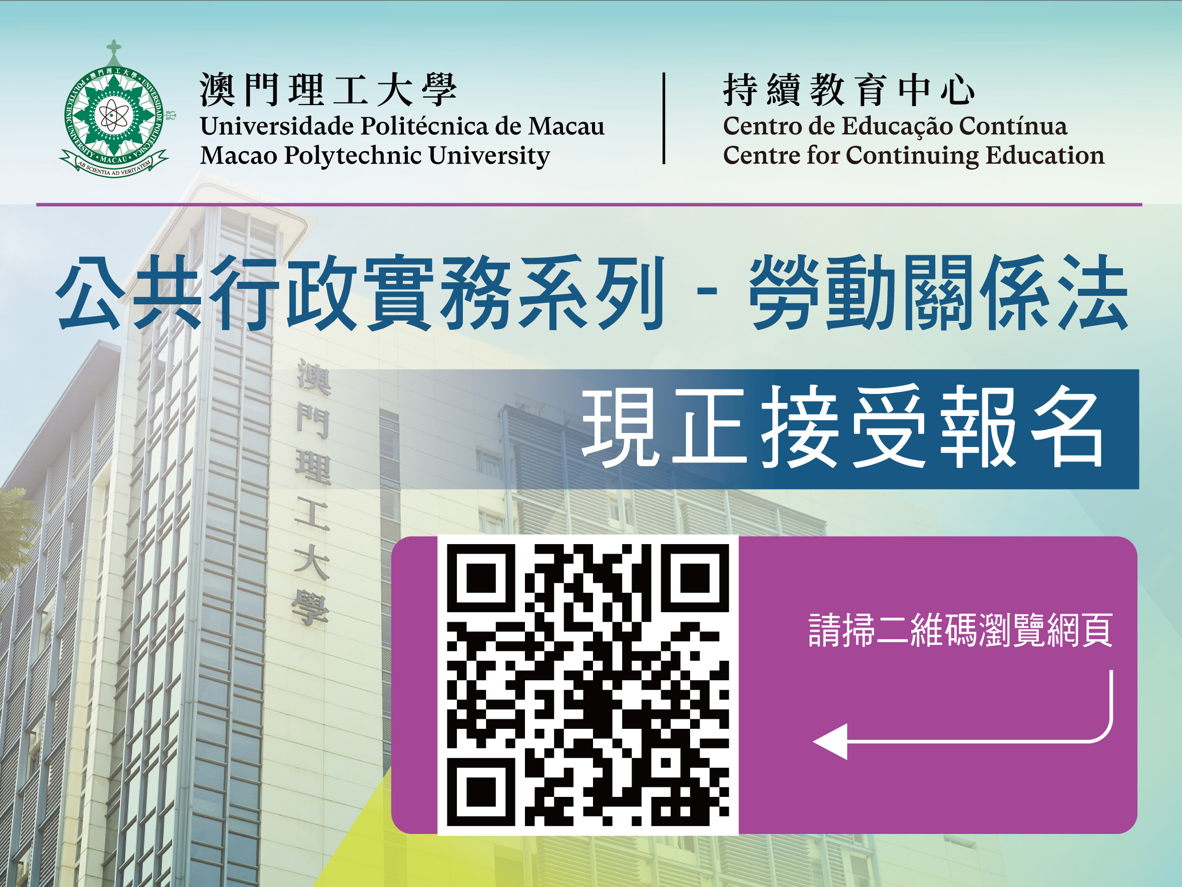本澳公私營機構人員提升專業能力、自我增值,參加各類技術進修課程和管理實務培訓,已經形成了積極的氛圍,對於建構知識型社會必不可少。澳門理工大學持續教育中心為回應居民進修的需求,以應對產業變遷的人才轉型需要,近期推出多個系列的課程面向公眾招生,第一季度招生課程已納入教育及青年發展局持續進修發展計劃,合資格人士可選擇以持修計劃個人帳戶餘額支付學費。其中公共行政實務系列現正招生課程還包括“取得財貨及提供勞務(公共採購)制度”、“行政程序法”、“公職法律制度”、“中文公文寫作”等。有意報讀的人士可以網上報名https://www.mpu.edu.mo/zh/cec_enrolment.php,查詢報名手續可於辦公時間致電87950707 / 87950832或電郵至cec@mpu.edu.mo。