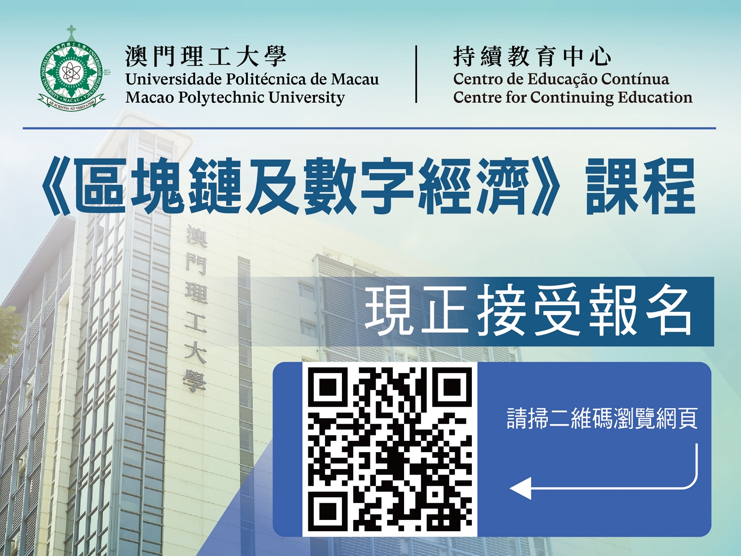 為配合數字經濟發展,有需要及時儲備具相關專業知識的人才資源。澳門理工大學持續教育中心為積極回應社會發展所需,開辦《區塊鏈及數字經濟》課程,適合金融從業人員以及對區塊鏈感興趣的人士報讀。課程現已接受報名,報名日期至2023年6月30日,額滿即止。