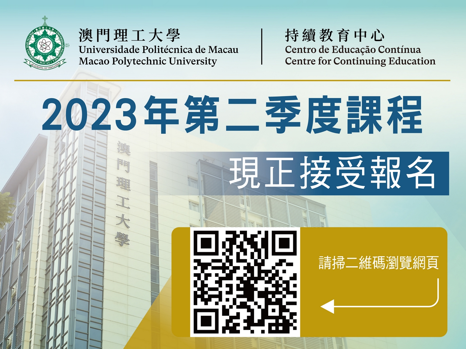 為支持市民裝備自我、提高競爭力,把握疫後經濟復蘇的發展機遇,澳門理工大學因應市民報讀專業培訓課程尤其是金融管理、科技應用、社工專業實務、商業應用以及公共行政實務等行業實務知識培訓需求甚殷,持續教育中心適時回應社會需求,2023年第二季將開辦八個不同系列、二十多項專業培訓課程,現已接受網上報名。