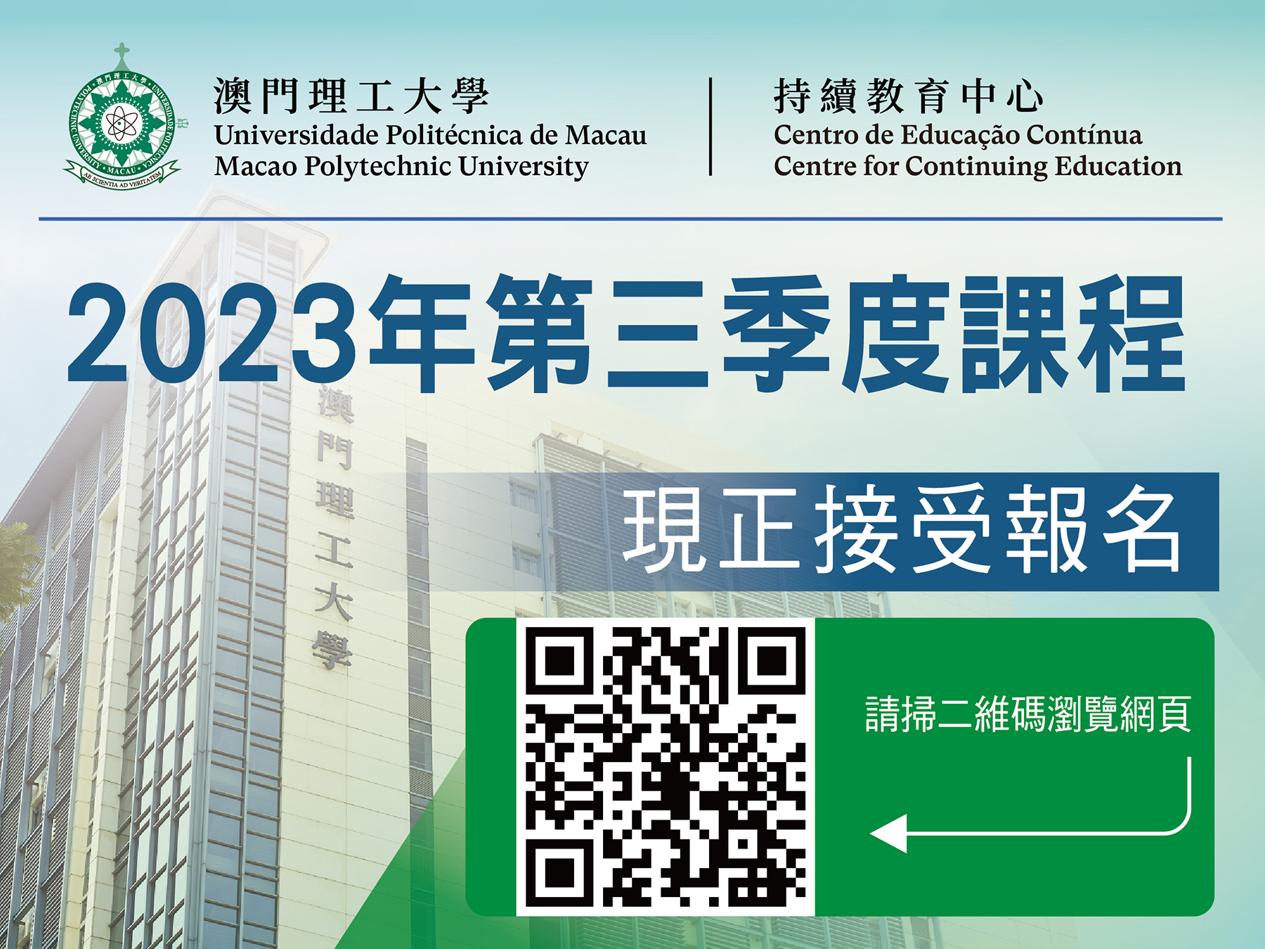 因應本澳居民積極把握機遇,裝備自我,提高個人競爭力、專業知識和能力,尤其對科技應用、公共行政實務、會展、藝術文創、社工實務等行業實務培訓需求甚殷,澳門理工大學持續教育中心適時回應社會需求,將於2023年第三季開辦十個不同系列、約三十項專業培訓證書課程公開招生,範疇涵蓋藝術和設計、科技及工程應用、公共行政、休閒旅遊會展、社工專業、商業應用、金融管理以及語言傳意等,現已接受網上報名。