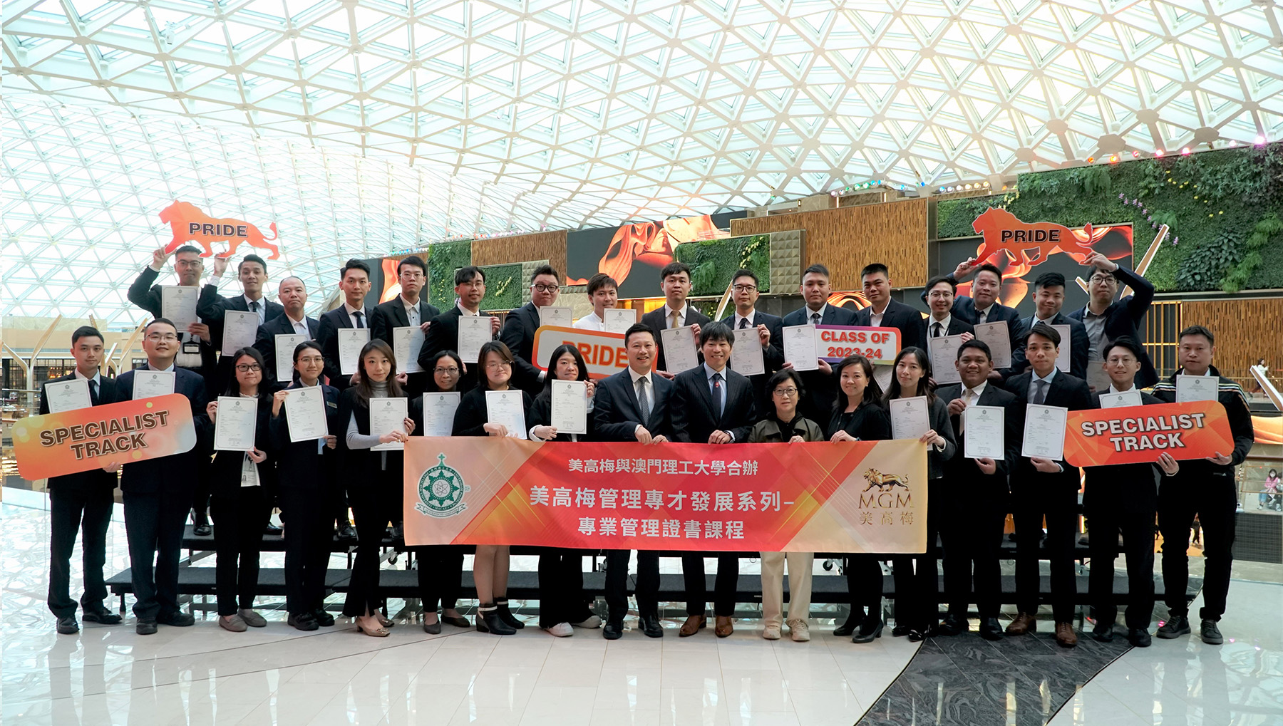 為加強高等教育與旅遊休閒行業合作,澳門理工大學博彩旅遊教學及研究中心為美高梅管理專才發展計劃開辦的專業管理證書課程日前結業,三十一名學員獲頒結業證書。學員通過課程提升管理知識與技能,獲益良多。