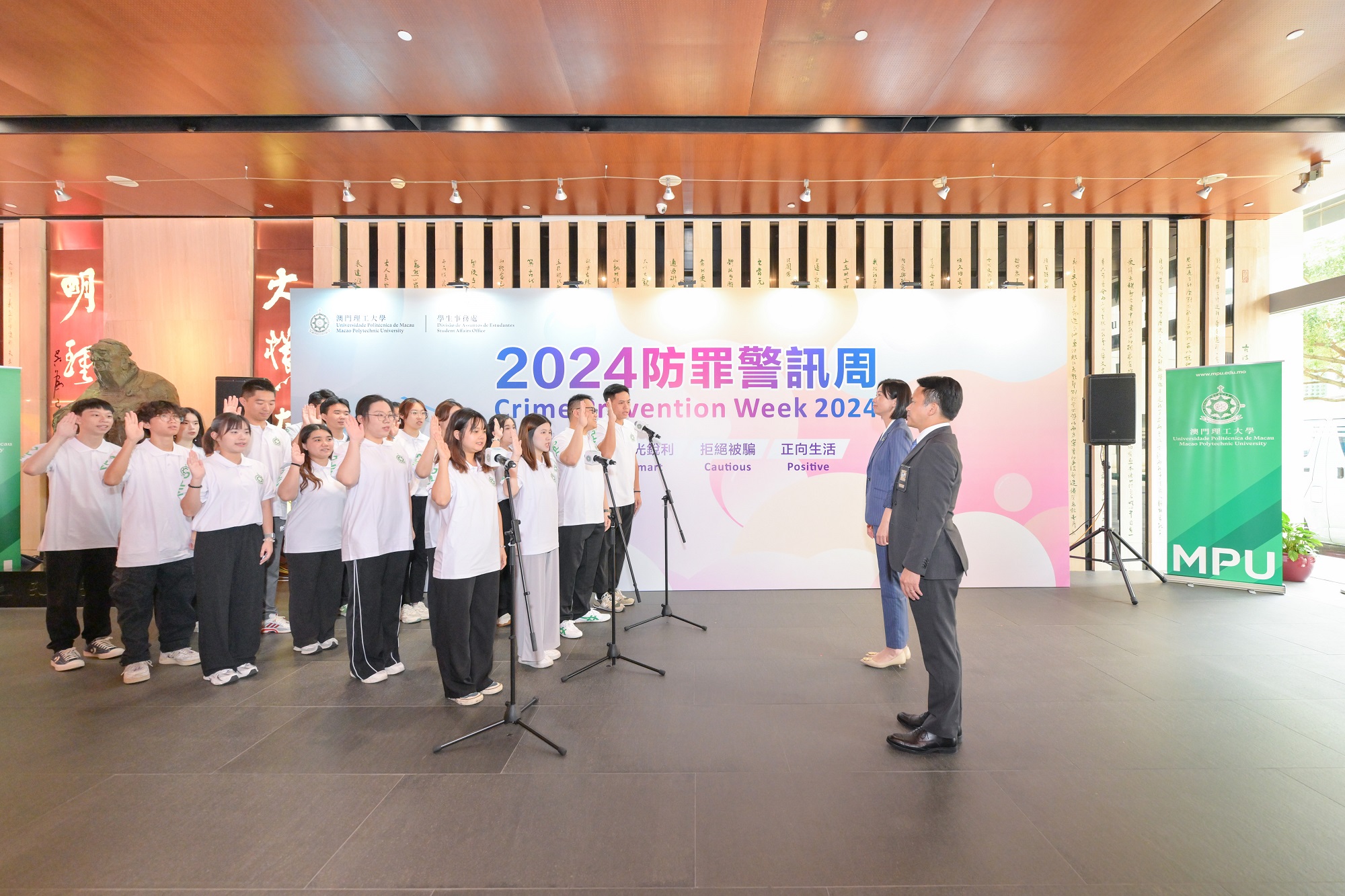 為讓學生積極參與校園防騙宣傳工作,澳理大舉辦"理智代表"防騙大使委任儀式。宣誓儀式由司法警察局副局長蘇兆強和澳門理工大學副校長李雁蓮共同主禮,一眾大使精神抖擻以宏亮的聲線和自信的言詞,在嘉賓及師長同學的見證下,莊重地宣讀誓詞,承諾肩負起"防騙大使"的職責,在校園積極推行防騙宣傳工作。其後,蘇兆強和李雁蓮頒發委任狀,勉勵一眾防騙大使謹守法律,以身作則,做好防騙宣傳,為校園防騙工作貢獻力量。
