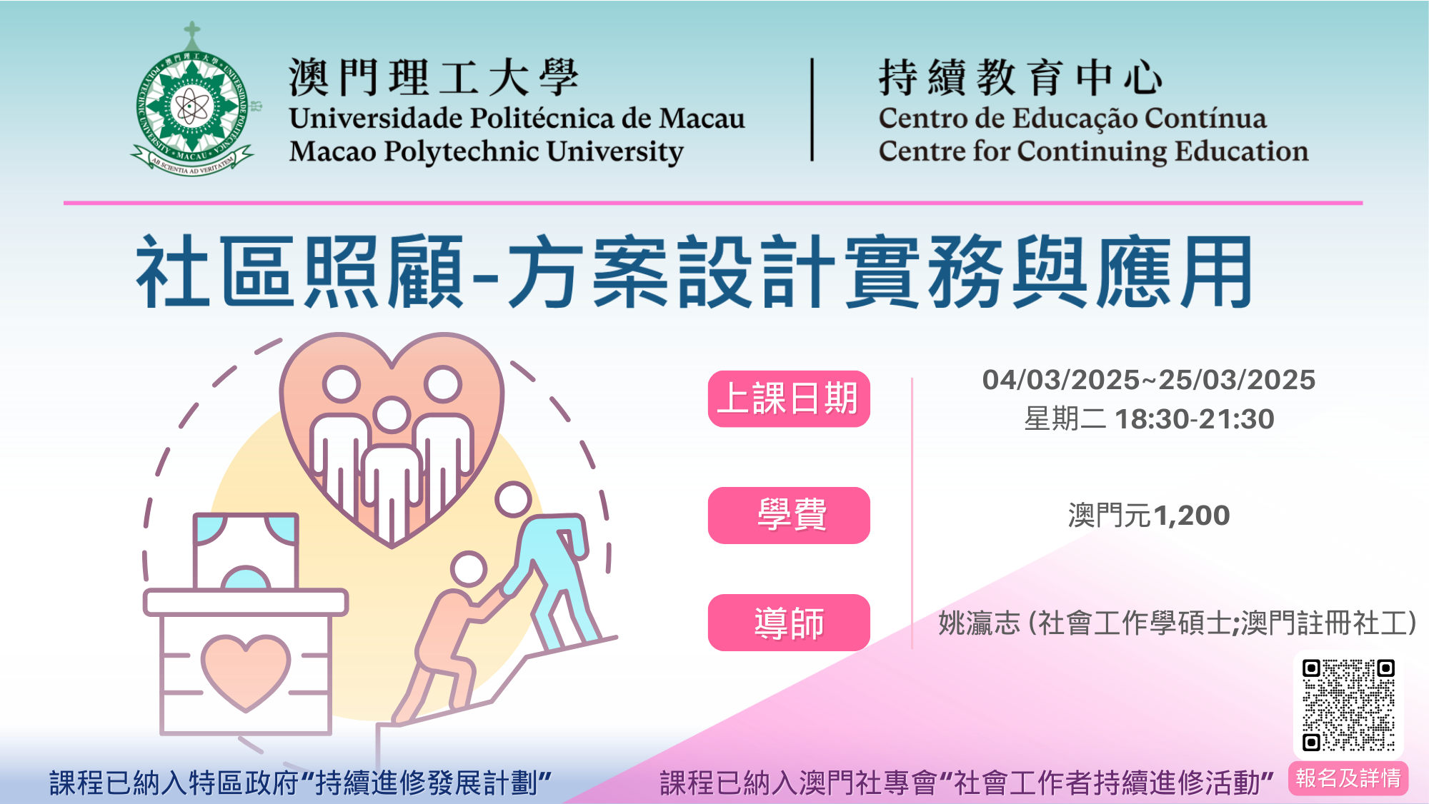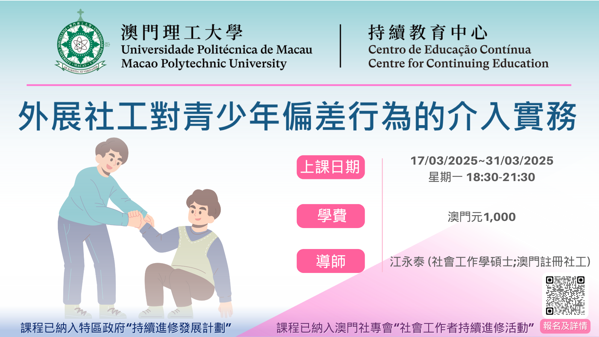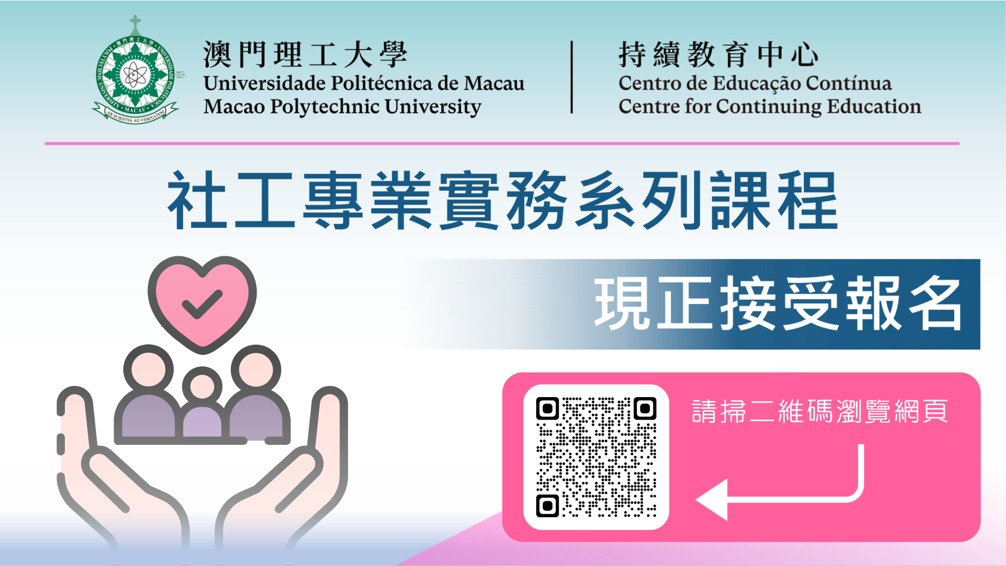為滿足社會工作服務領域對專業技能日漸增加的需求,提升社會工作者及相關人士的專業知識及技能,澳門理工大學持續教育中心將於2025年3月開辦兩項社工專業實務課程─“外展社工對青少年偏差行為的介入實務”和“社區照顧—方案設計實務與應用”。課程均獲澳門社會工作者專業委員會認可為社會工作者持續進修(CPD)活動,並獲納入教育及青年發展局持續進修發展計劃, 歡迎社會工作者、相關專業人士,以及對課程感興趣人士報讀。