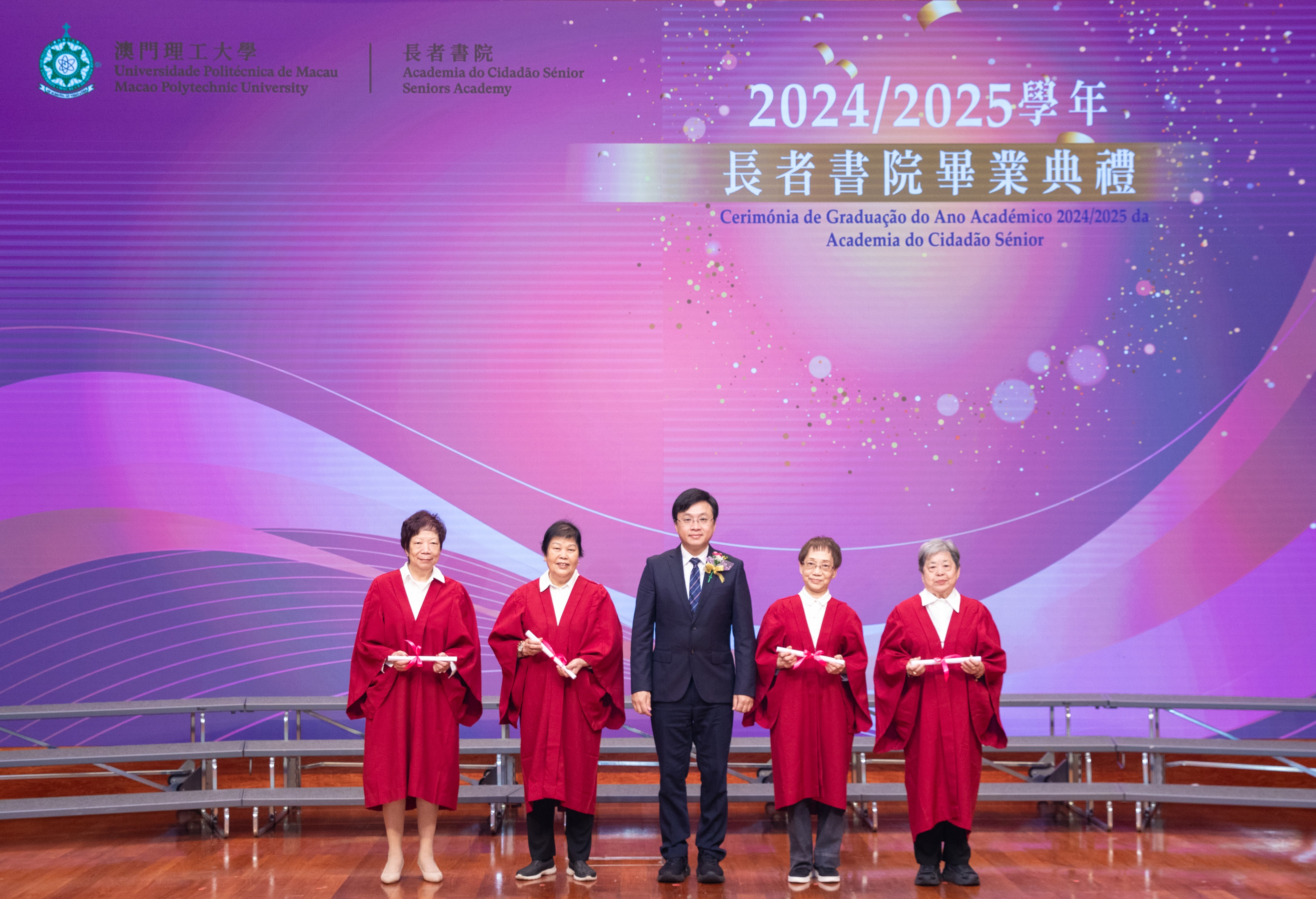 澳門理工大學長者書院畢業典禮由澳門理工大學校長嚴肇基、澳門特區政府社會工作局代局長許華寶、澳門明愛服務總監袁志海,以及長者書院代院長鄧曉霞主禮。嚴肇基祝賀學員們學有所成,同時表示,作為澳門第一所高等教育機構專為長者而開設的教學單位,澳門理工大學長者書院實踐持續教育的理念,具有26年辦學經驗,透過開辦各類課程支持長者持續學習。為配合特區政府支持居民持續進修的施政方針,新學年長者書院繼續在電腦、語言、文化、藝術、健康等領域開辦課程。