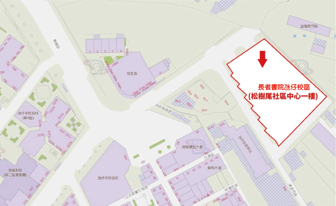 長者書院氹仔分校於2019年11月落成啟用,校址位於氹仔中心地帶的律政司街松樹尾社區中心一樓,地下為松樹尾巴士總站,鄰近官也街及地堡街,地點便捷。氹仔分校的設計以長者的身心特點為考量,環境清幽,除一般教室外,還設有電腦室、音樂室、書畫室、多功能室及學生活動室等,以配合不同的教學需要。